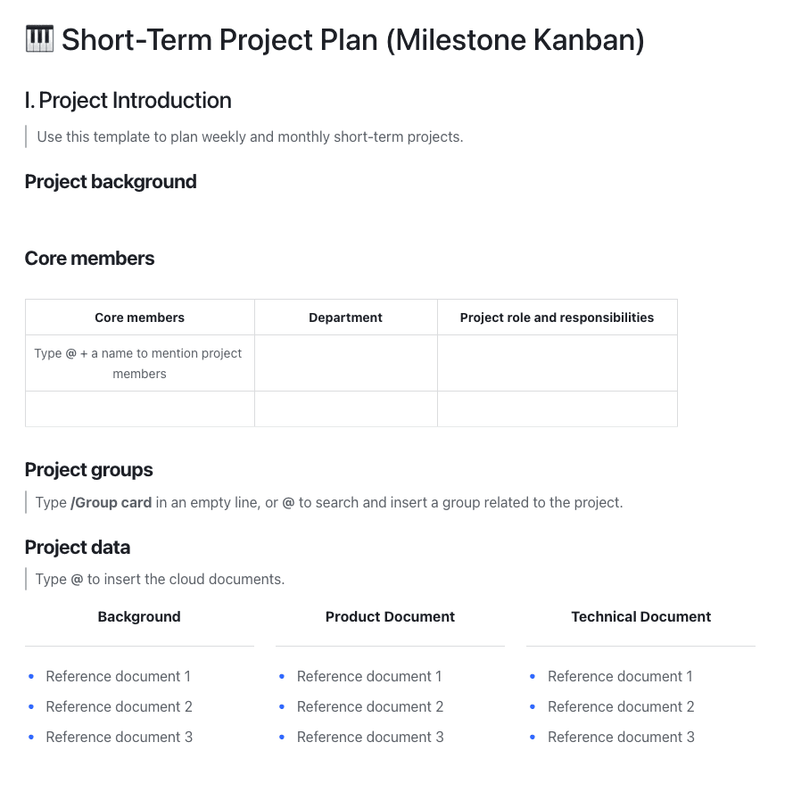 This template is designed to help you plan and manage short-term projects by providing a structured format for project introduction, objectives, milestones, task breakdown, regular meetings, and material summary. It allows you to easily organize project background, core members, project groups, and project data, as well as set objectives and key results. The template also includes sections for weekly milestones, task breakdown, and regular meeting updates, ensuring that your team stays on track and aligned throughout the project.