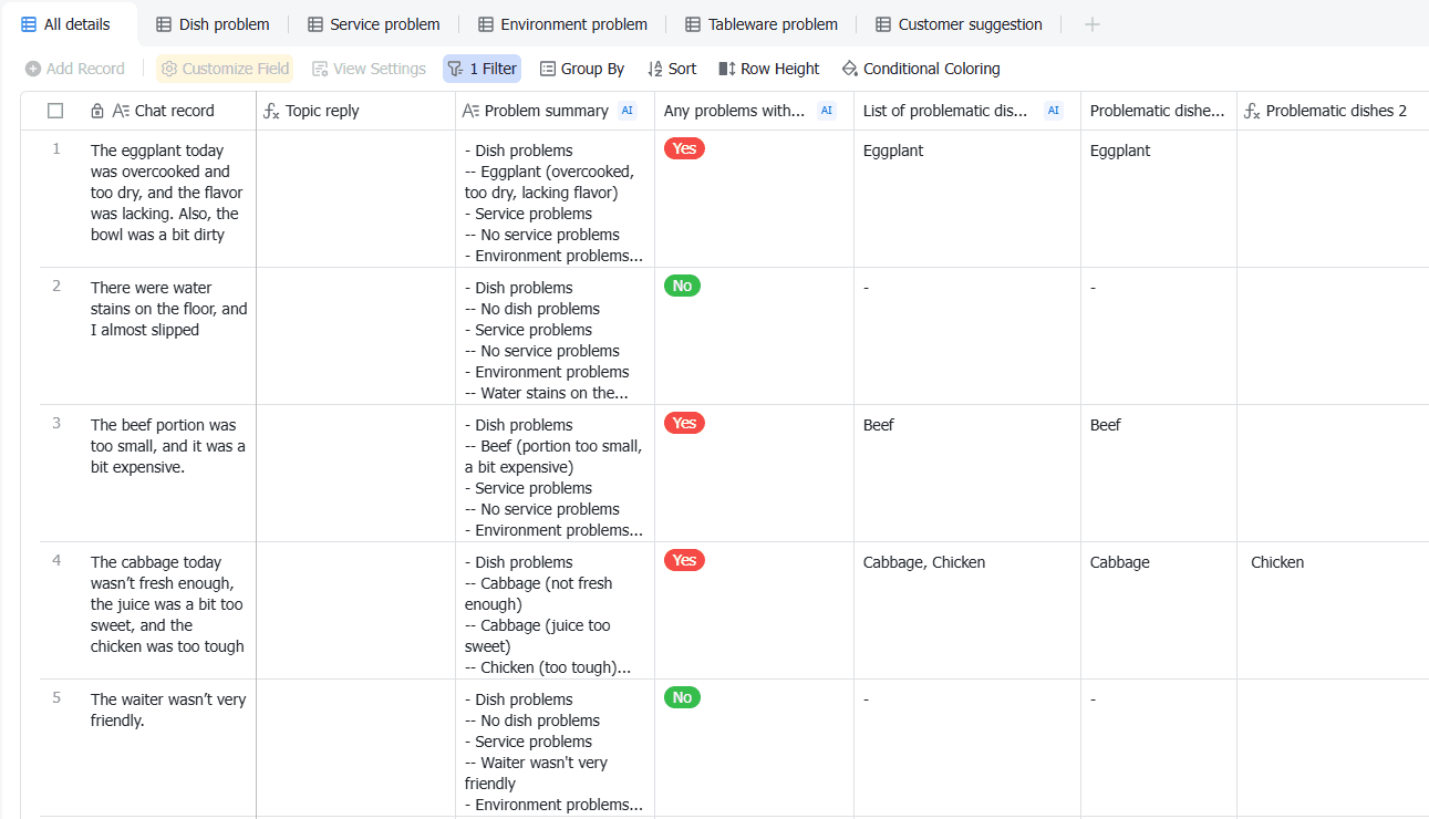This template is designed to help you efficiently manage and structure your store's customer feedback. It includes sections for daily feedback summary, dashboard, and all details. It also allows you to categorize feedback into different areas such as dish problems, environment problems, customer suggestions, service problems, and tableware problems. Additionally, it provides features to add records, customize fields, view settings, filter, group by, sort, and adjust row height. It also includes a conditional coloring feature for easy visualization and understanding of the feedback.