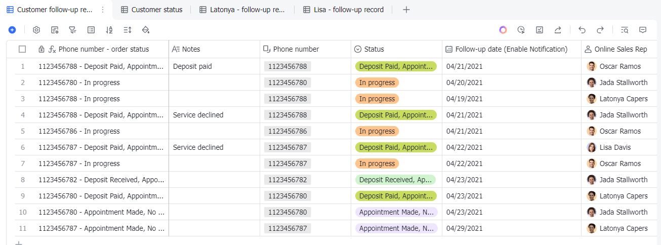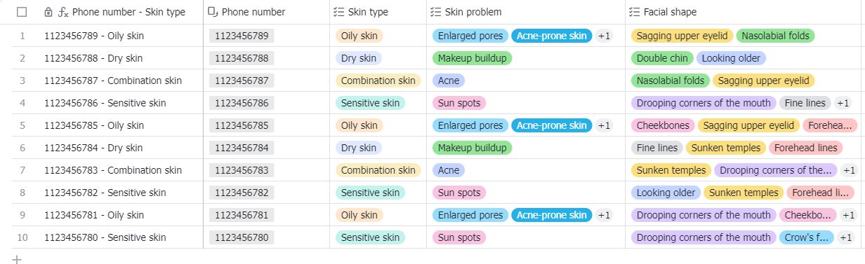 This template is a comprehensive tool for managing customer skin profiles in a store. It includes fields for customer phone numbers, skin types, skin problems, and facial shapes. This template is designed to help store managers and beauty consultants keep track of their customers' skin conditions and preferences, enabling them to provide personalized product recommendations and services.