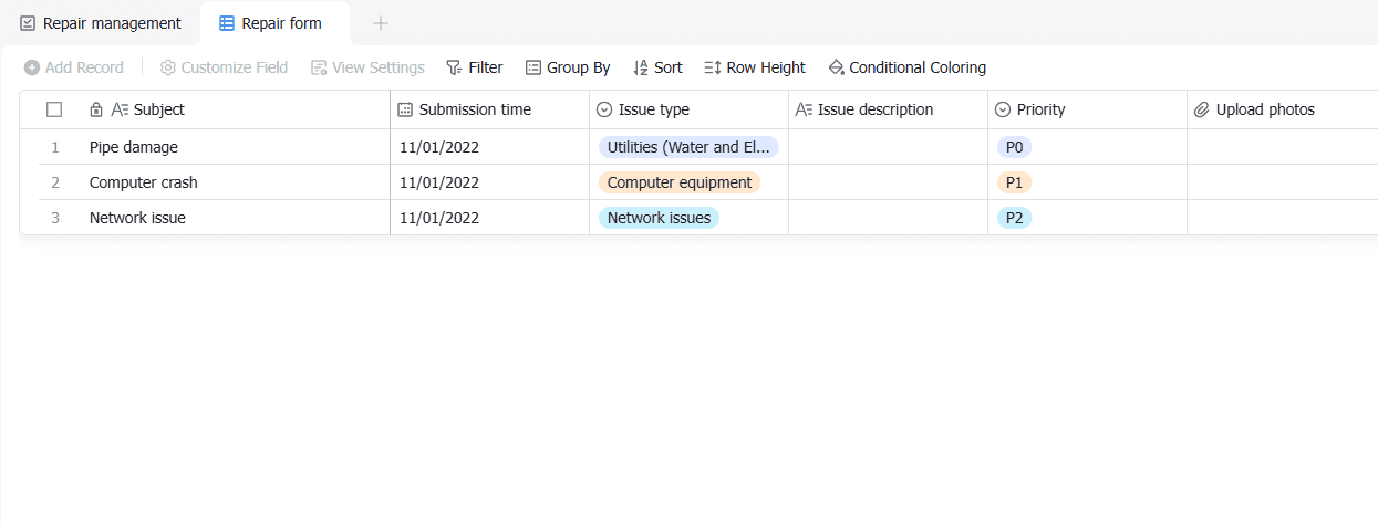 - Customizable: The template includes customizable fields, allowing you to tailor the platform to your specific needs. Whether you need to track issue types, repair handlers, or priority levels, this template has you covered.