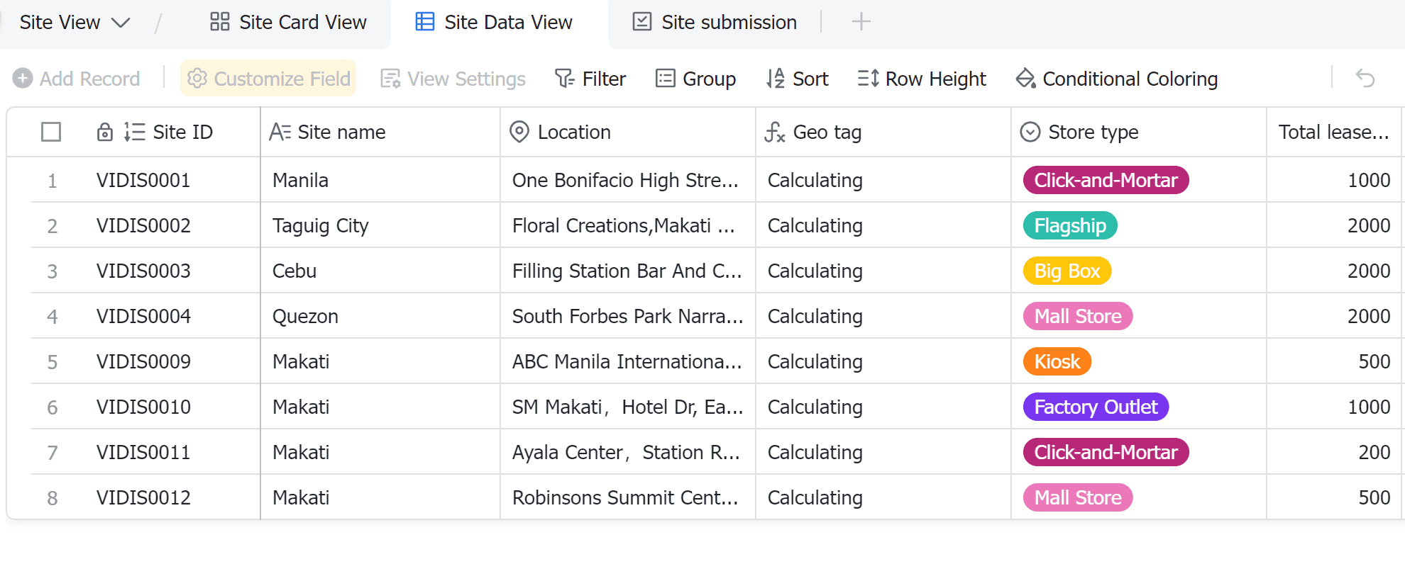 This template is designed for retail businesses, particularly those with multiple store locations. It's perfect for store managers, retail operations managers, and business owners who need to keep track of their store sites and evaluate their performance. Whether you're a large retail chain with hundreds of stores or a small business owner with a few locations, this template can help you manage your sites more effectively. It allows you to: