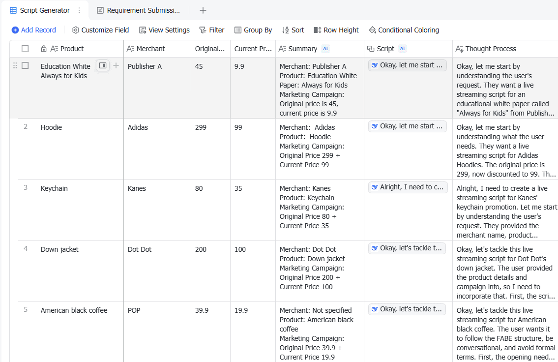 The Super Livestreaming Team template is a comprehensive tool designed to assist in planning, executing, and analyzing live streams. It includes features such as a Live Stream Planning Master, Million-Dollar Script Generator, and Post-Stream Analysis Expert. This template allows you to add, record, and customize fields, view settings, filter, group, sort, and even generate forms. It also includes a conditional coloring feature for easy visualization of data.