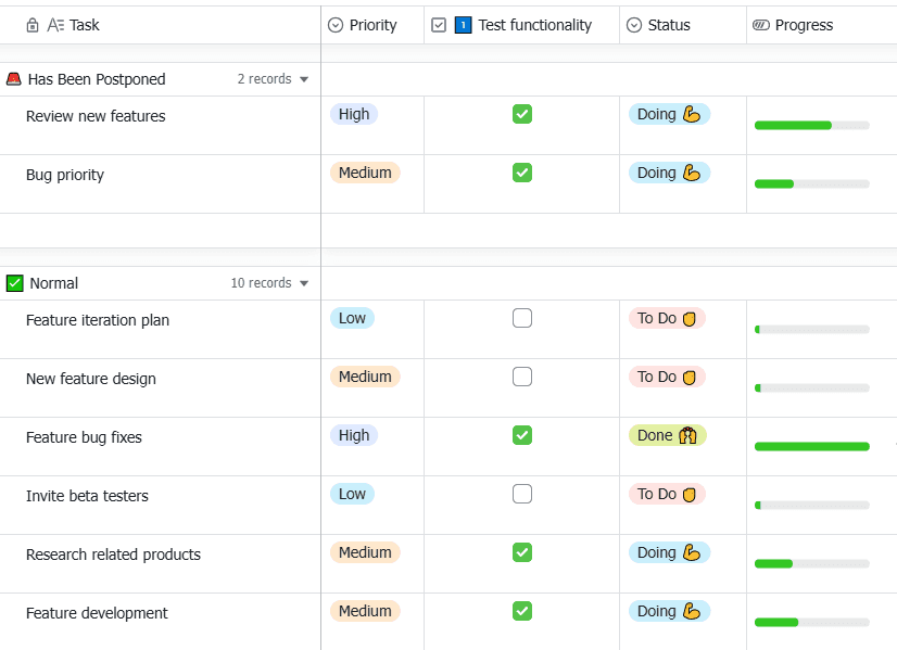This task management template is designed to help you keep track of all your tasks in one place. It includes a task list, status kanban, progress gantt chart, and task calendar. The template allows you to add records, configure fields, filter tasks, group tasks, and sort tasks. It also includes a color-coding feature for easy visual reference. The template includes fields for task name, priority, test functionality, assess usability, gather feedback, status, and progress.