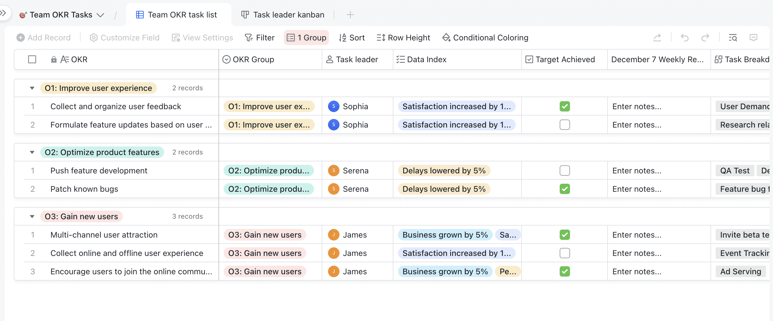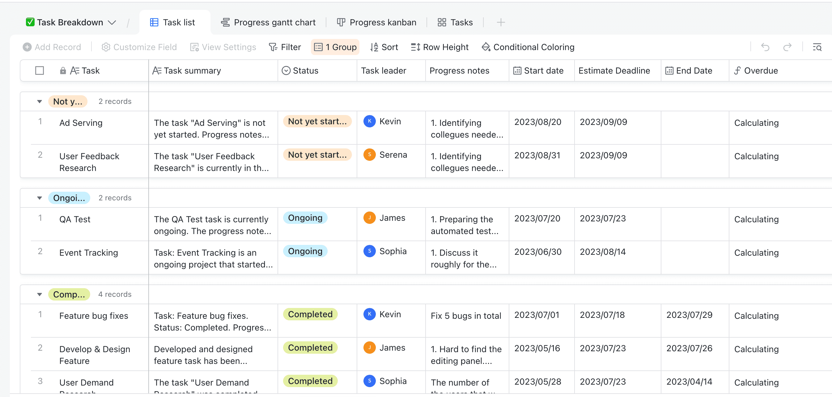 The Task Management: AI Autofill Task Summary template is a comprehensive tool designed to streamline task management. It provides a detailed breakdown of tasks, task lists, and progress charts in both Gantt and Kanban formats. The template also includes features such as record addition, field configuration, view configuration, filtering, grouping, sorting, row height adjustment, and color coding. It is designed to provide a clear and concise overview of all tasks, their status, leaders, progress notes, start dates, and estimated completion times.
