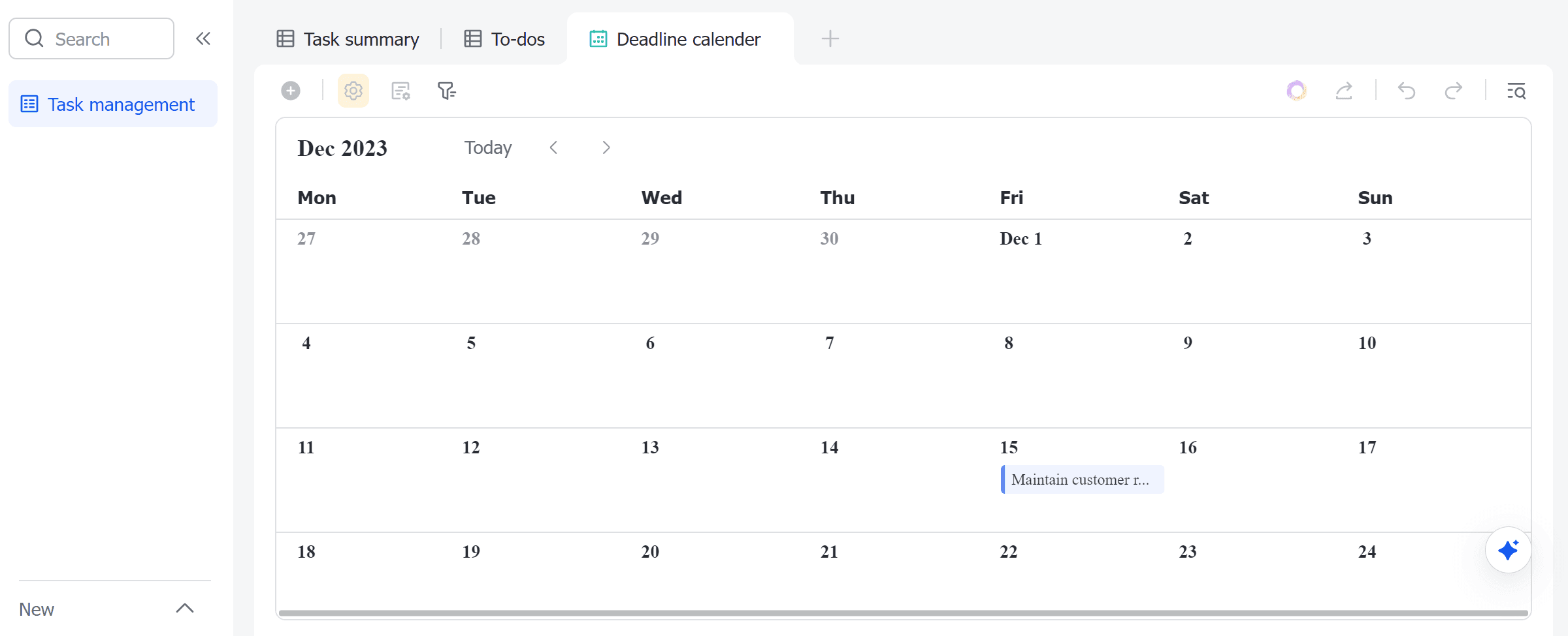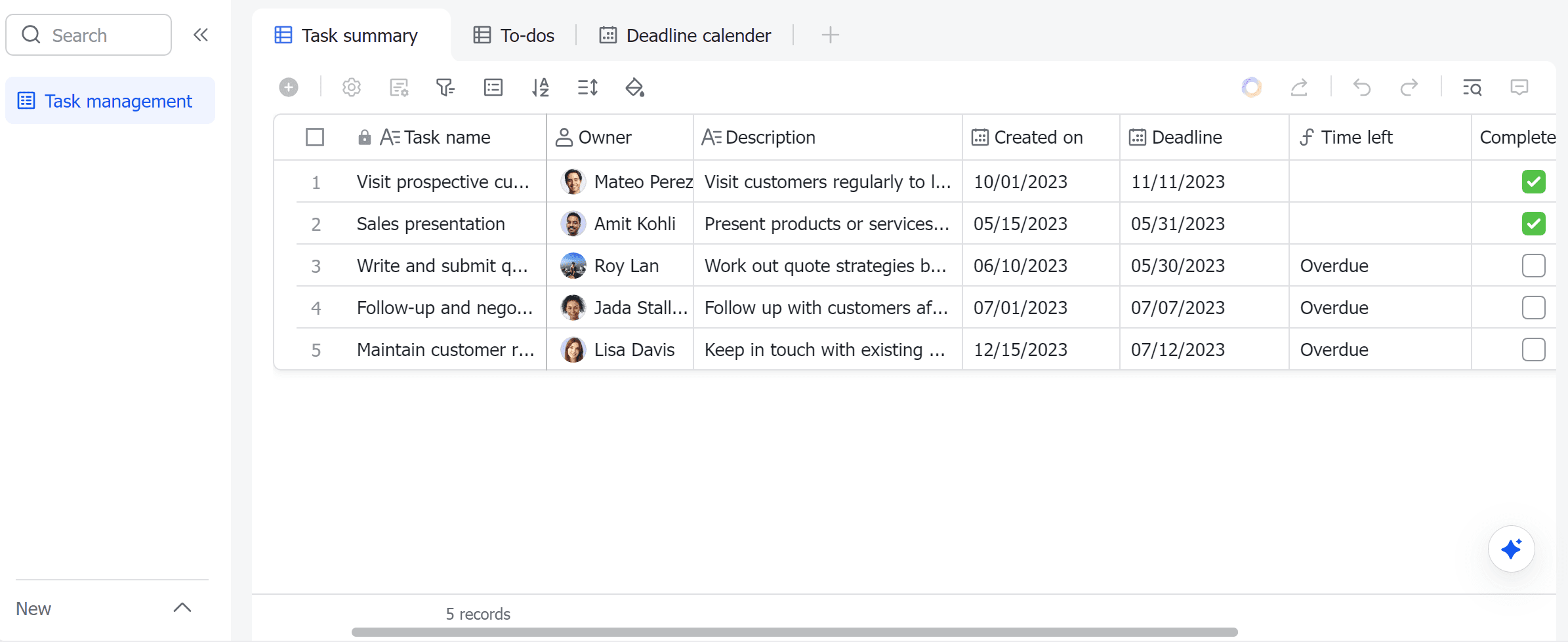 The task management template is a comprehensive tool designed to help you keep track of all your tasks in one place. It includes fields for task name, owner, description, and creation date, allowing you to have a clear overview of all your tasks. The template also includes features for adding records, configuring fields, setting up views, filtering, grouping, sorting, and coloring rows, providing you with a high level of customization to suit your specific needs.
