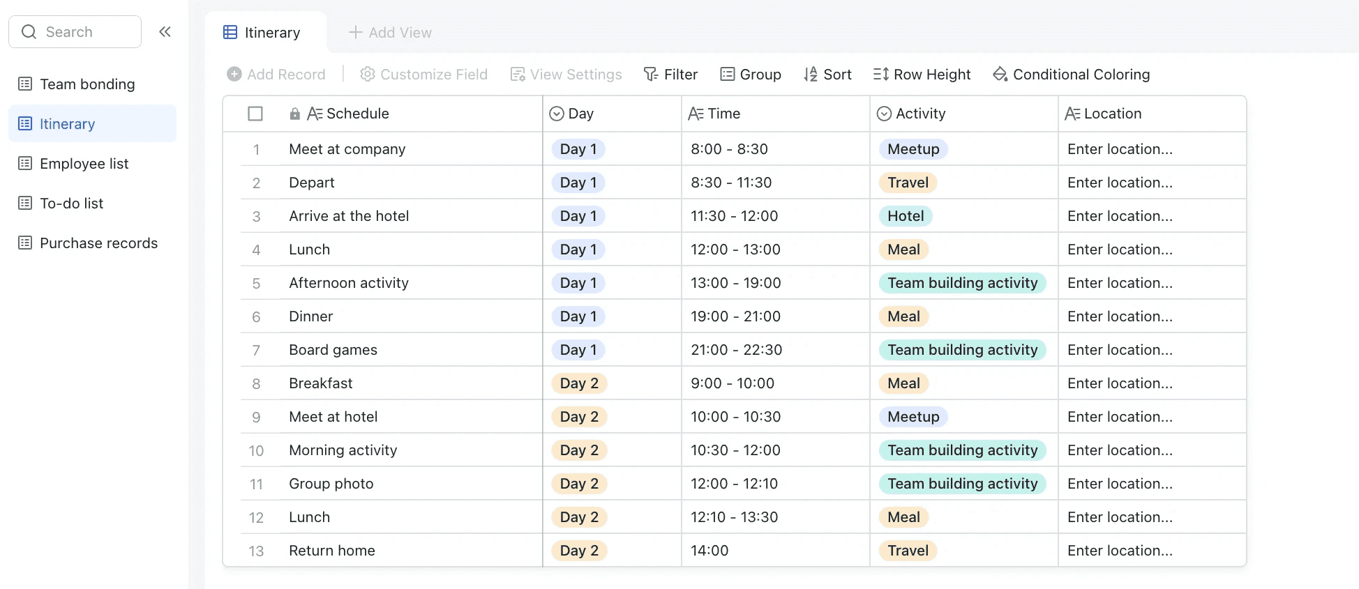 Team bonding activities are crucial for fostering a positive work environment and boosting employee morale. However, planning and executing these activities can be a daunting task. That's where our 'Team Bonding' template comes in. It provides a comprehensive platform to plan activities, schedule itineraries, and even allows team members to vote on their preferred activities. Whether you're planning a one-day trip, a two to three days trip, or a 2 days 1 night trip, this template has got you covered.
