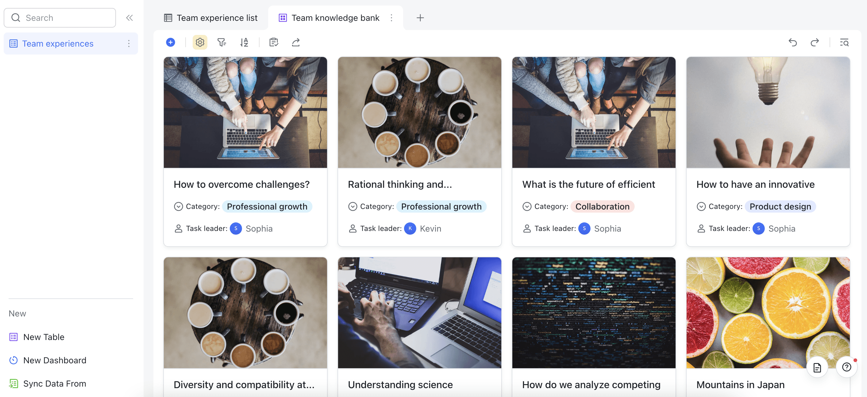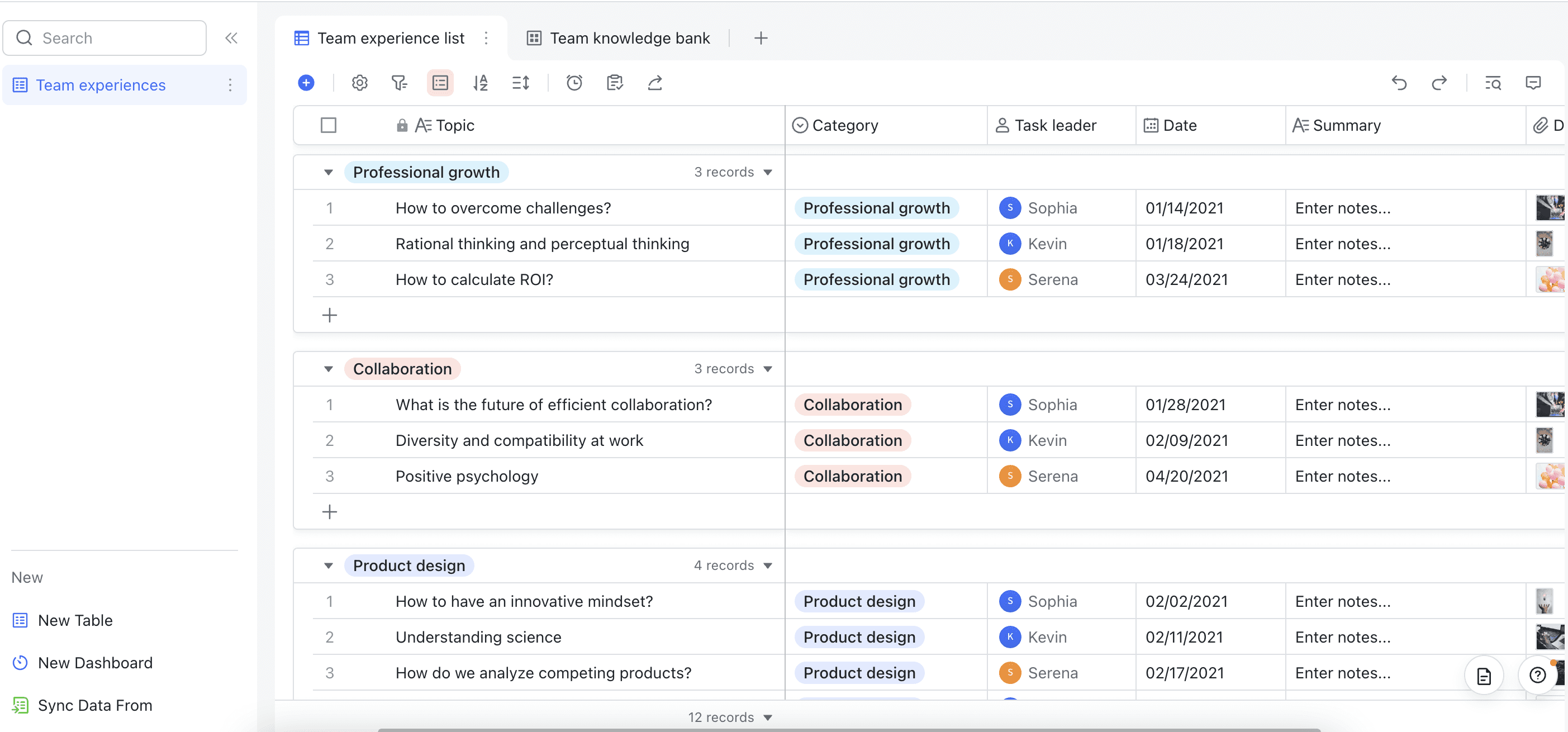 In today's fast-paced work environment, it's essential for teams to continuously learn and grow together. Our Team Improvement Experience template is designed to help your team collaborate on insightful articles and discussions, covering topics such as professional growth, collaboration, product design, and more. Each person from your team can take charge of researching specific areas on how to improve your team! With this template, your team can easily share articles, discuss ideas, and learn from each other's experiences, ultimately leading to a more cohesive and productive team.
