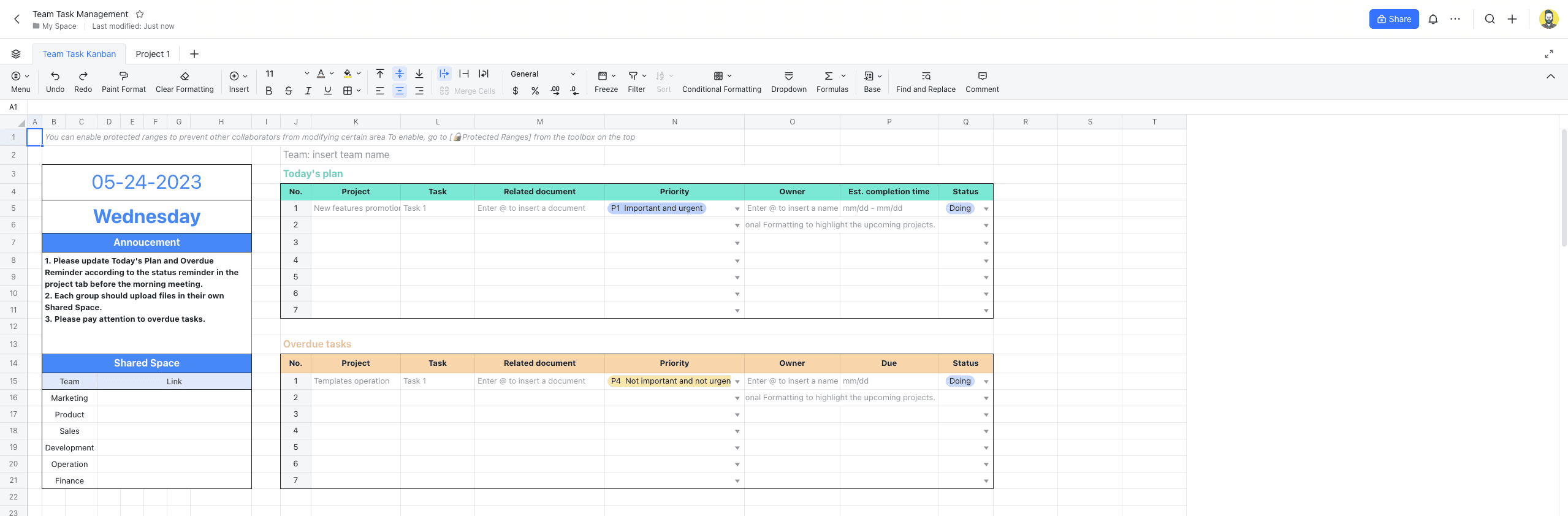 This template is designed to help teams efficiently manage their tasks, projects, and shared documents in one centralized location. It includes features such as priority levels, task owners, estimated completion times, and status updates. Additionally, it offers a daily plan, overdue tasks reminders, and shared space for each department to collaborate effectively.
