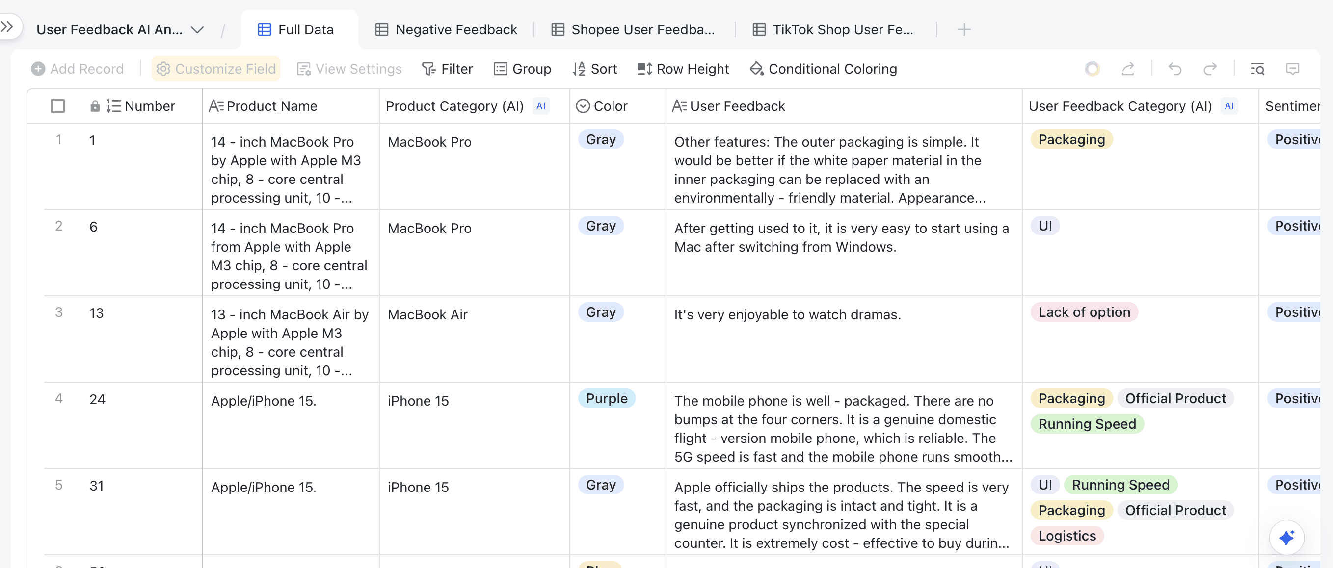 The User Feedback AI Analysis template is a comprehensive tool designed to help businesses understand and analyze customer feedback. It uses artificial intelligence to categorize feedback into different areas such as product name, product category, color, and sentiment. It also provides a dashboard view of user feedback scores, orders by e-commerce platform, and user feedback results. This template is designed to help businesses gain insights from customer feedback and make data-driven decisions.