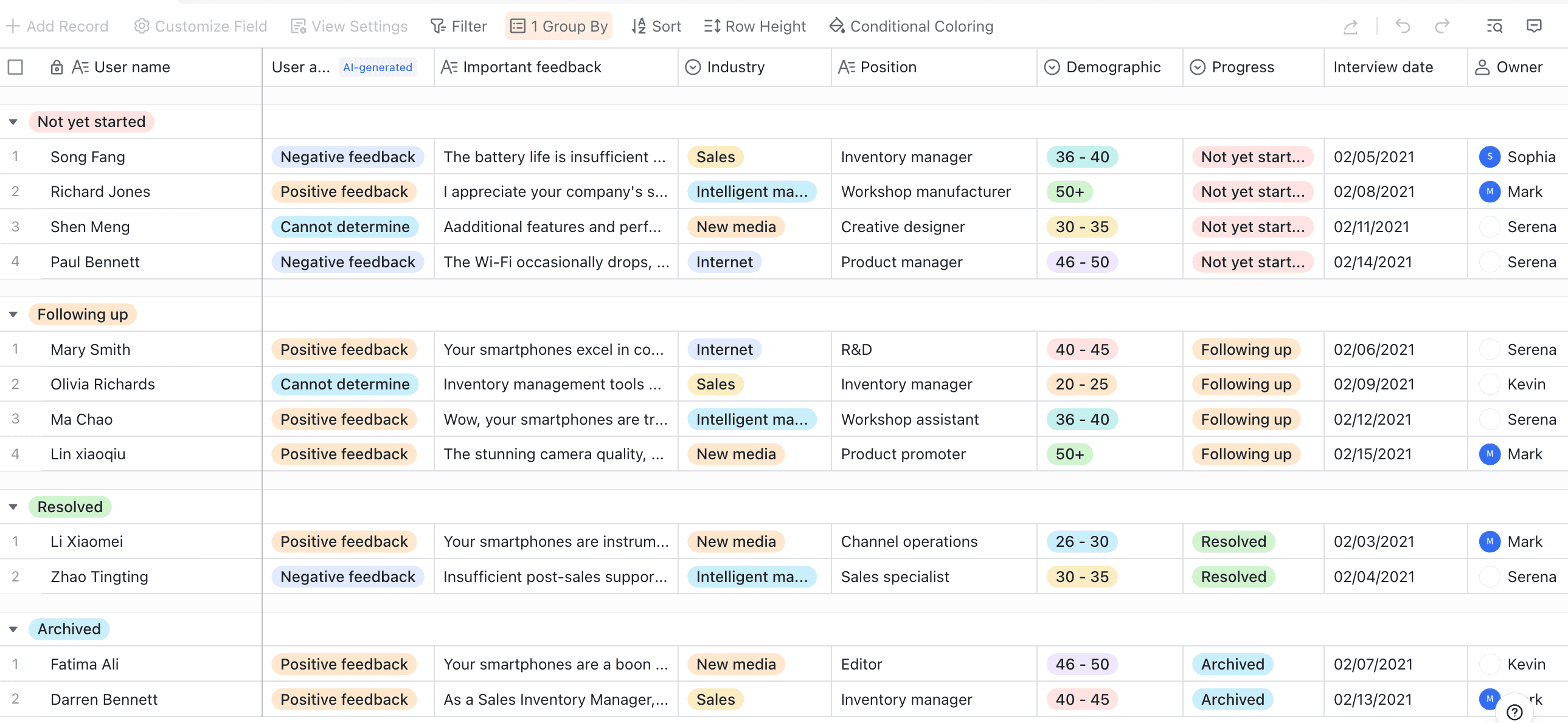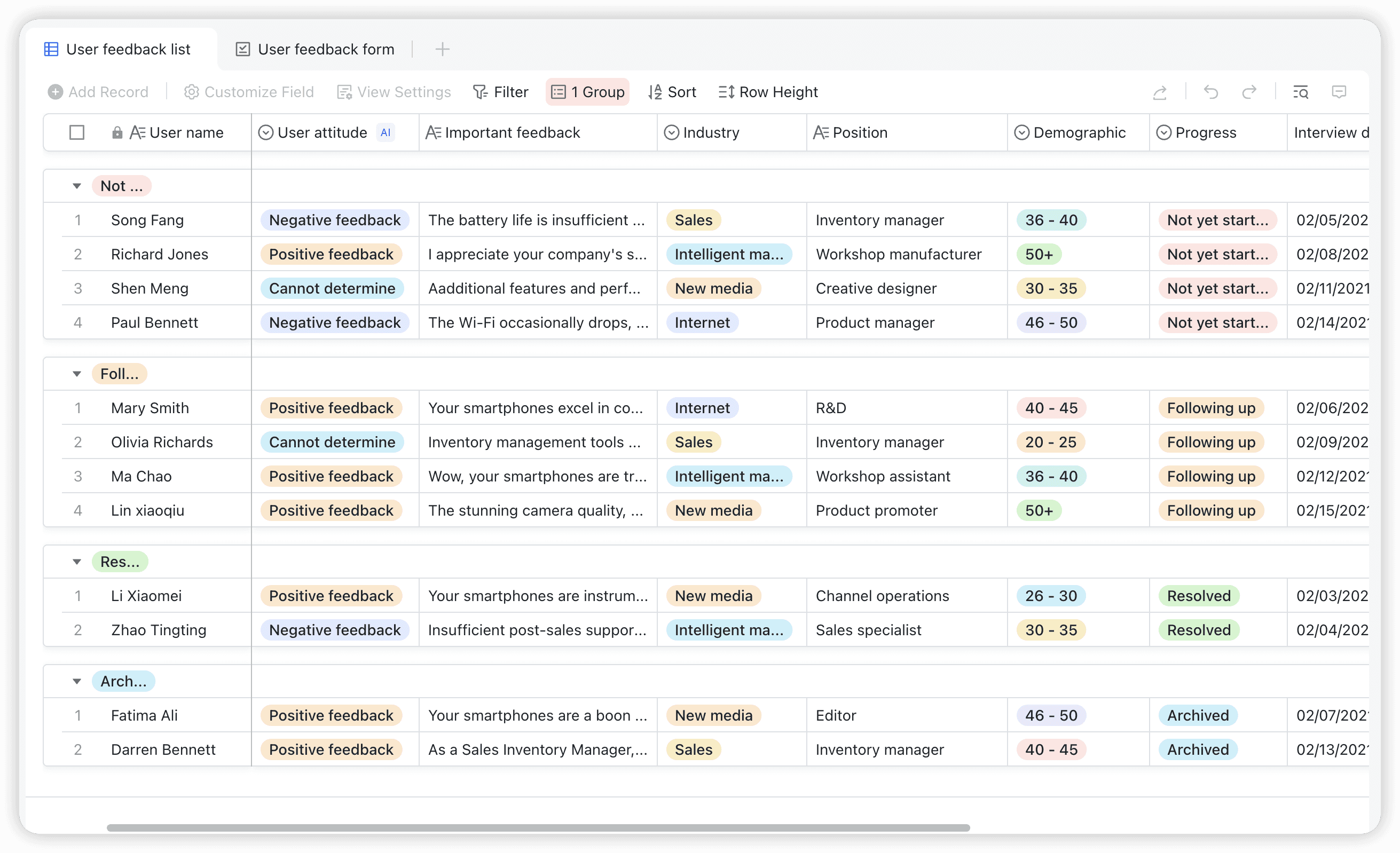 - Comprehensive Analysis: By capturing diverse data points like user attitude, important feedback, industry, and position, this template allows for a comprehensive analysis of user feedback.