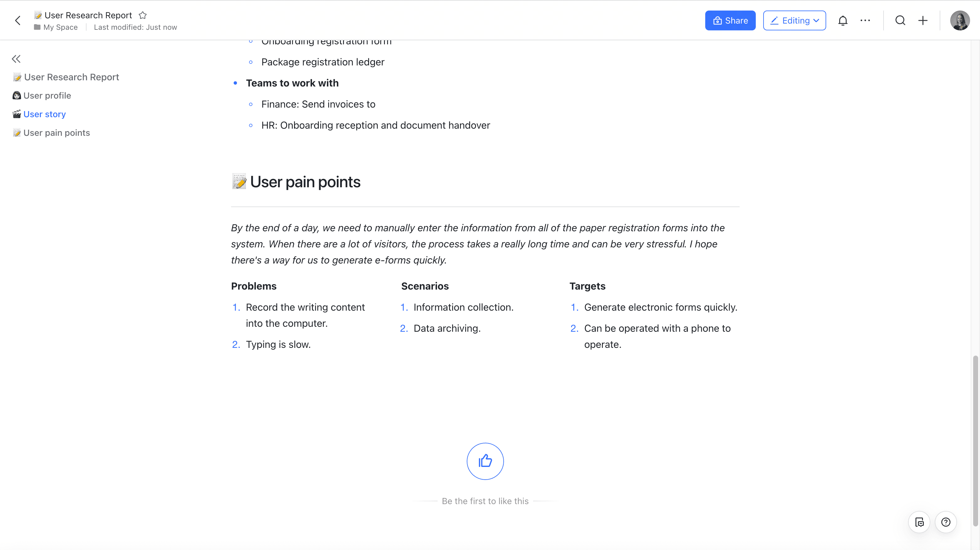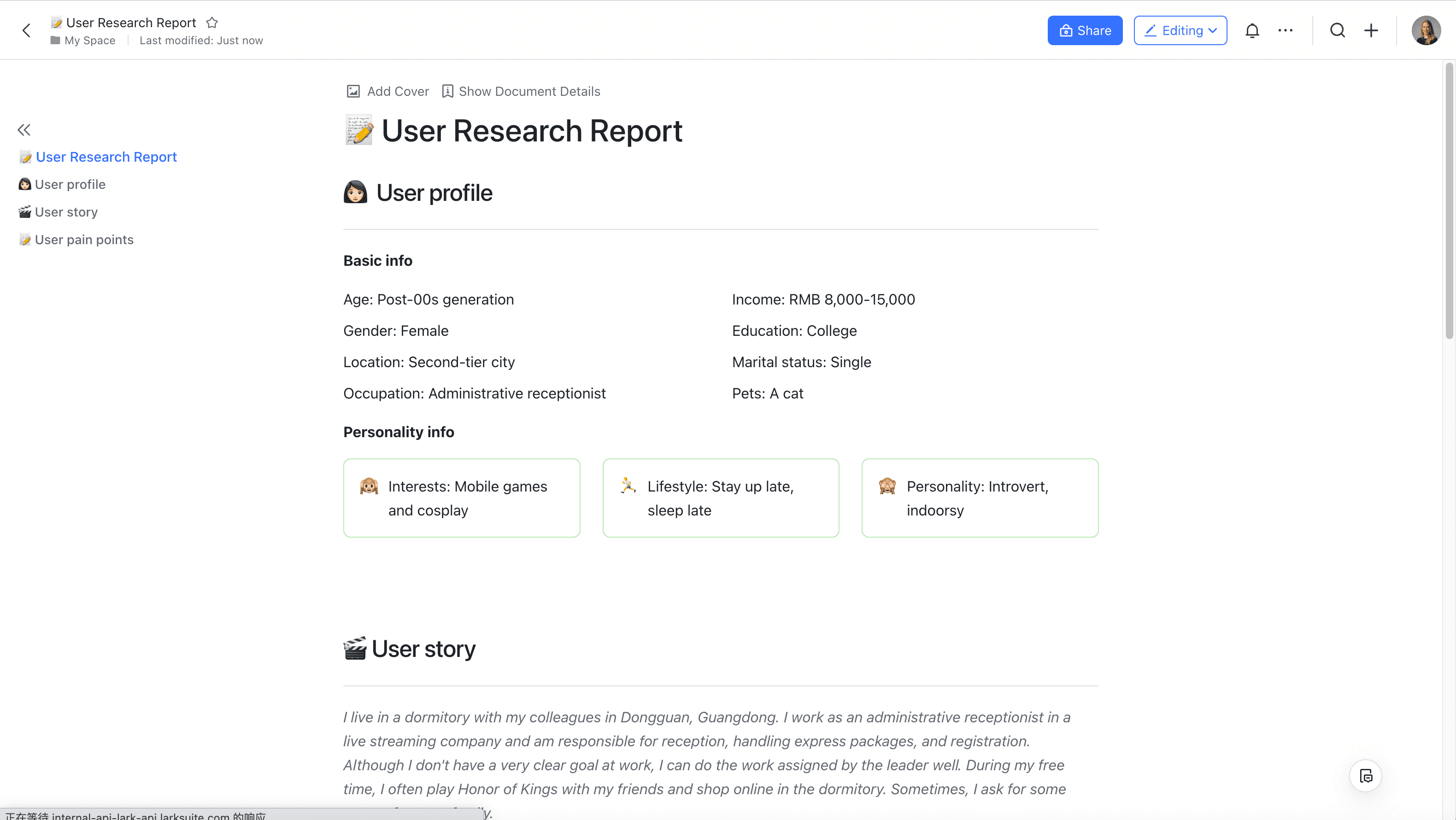 User research is a crucial aspect of understanding your target audience and improving your product or service. This user research report template is designed to help you compile and organize all the essential information about your users, including their demographics, interests, lifestyle, work habits, and pain points. With Lark's user-friendly interface, you can easily input and analyze data, making it simple to identify trends and areas for improvement.