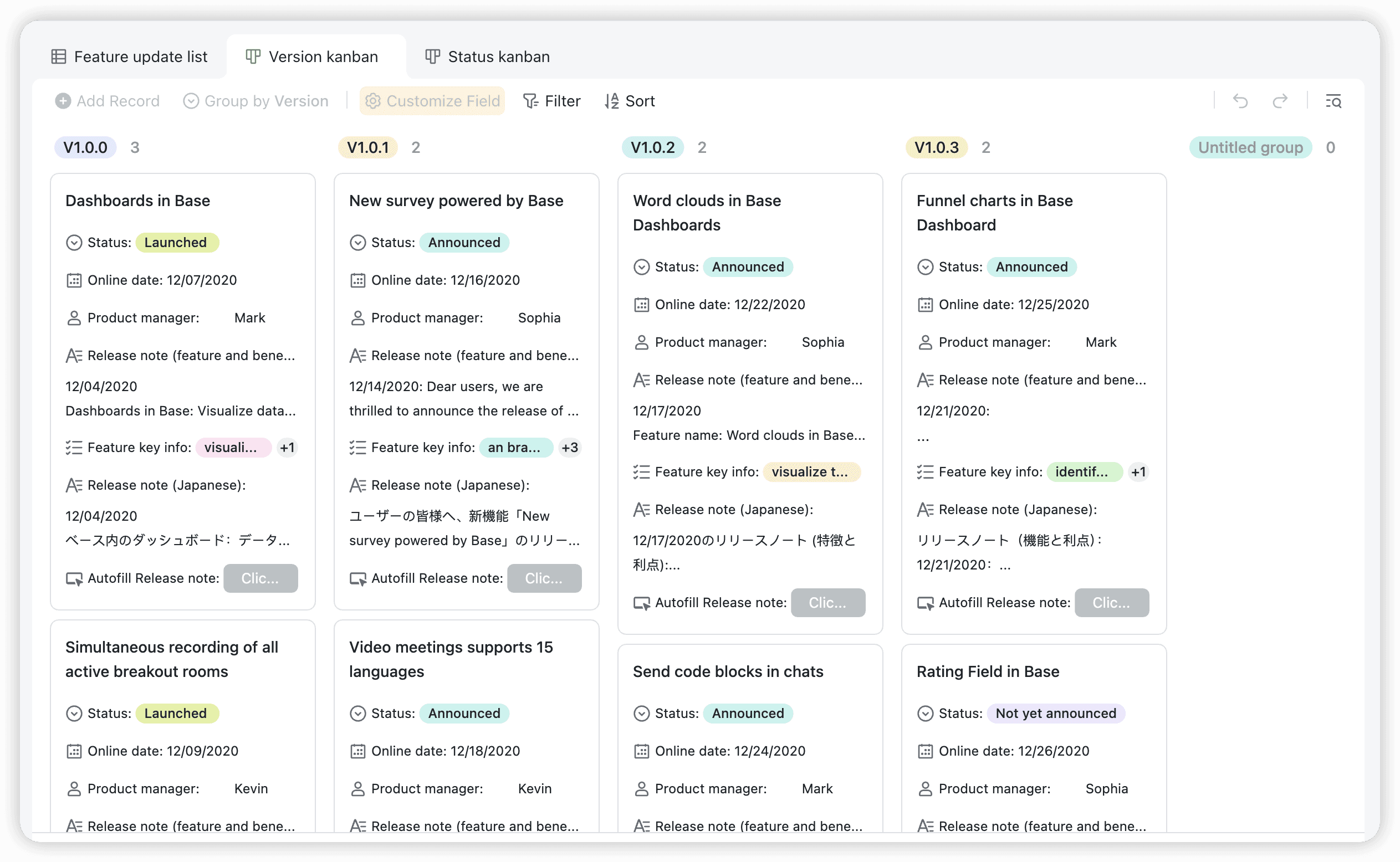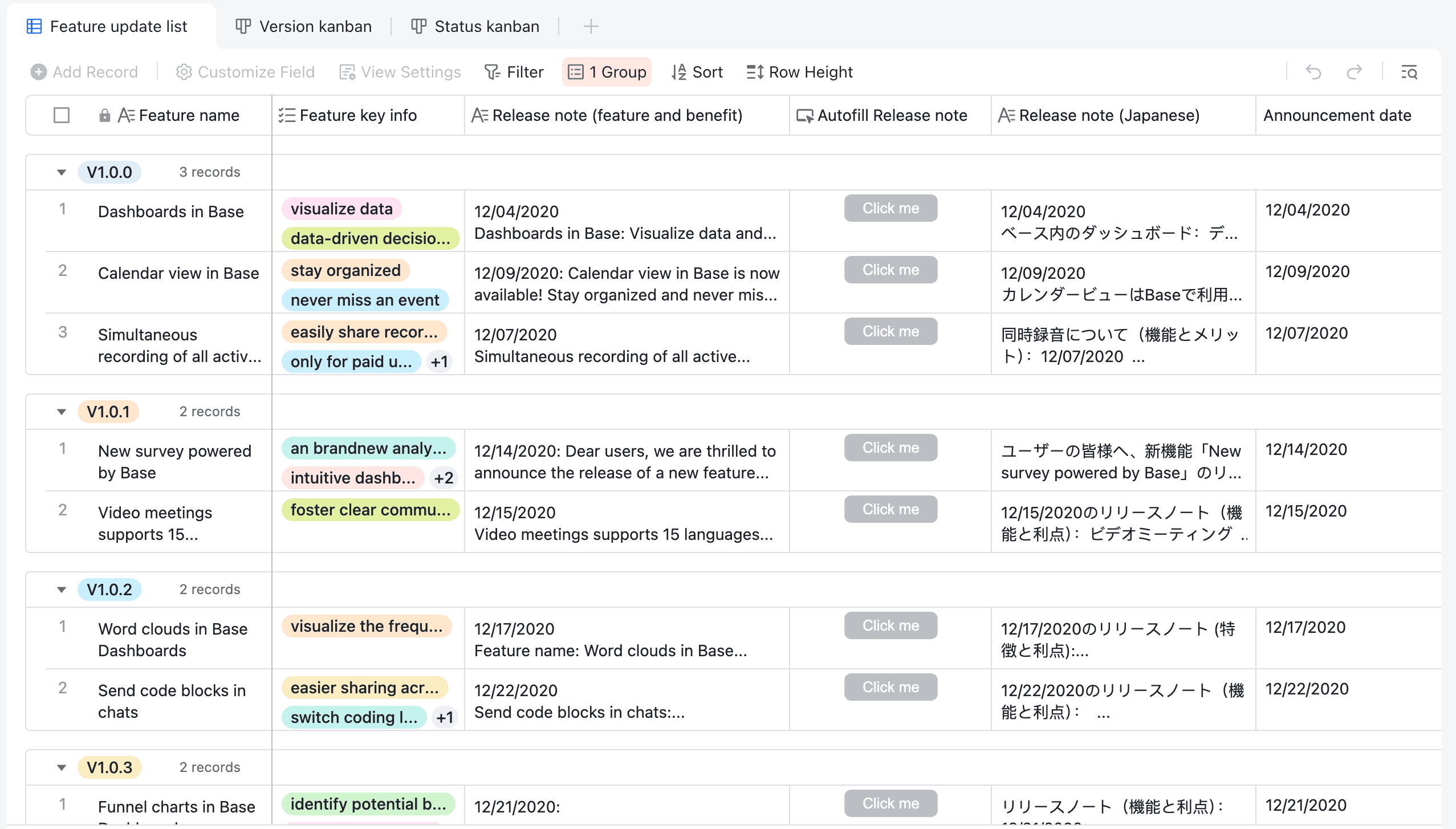 The AI Autofill Release Notes template is a comprehensive tool for managing and tracking software version updates. It includes features such as a feature update list, version kanban, status kanban, and search functionality. It also provides a dashboard for visualizing data and a record customization field. The template is designed to help you stay organized and make data-driven decisions.
