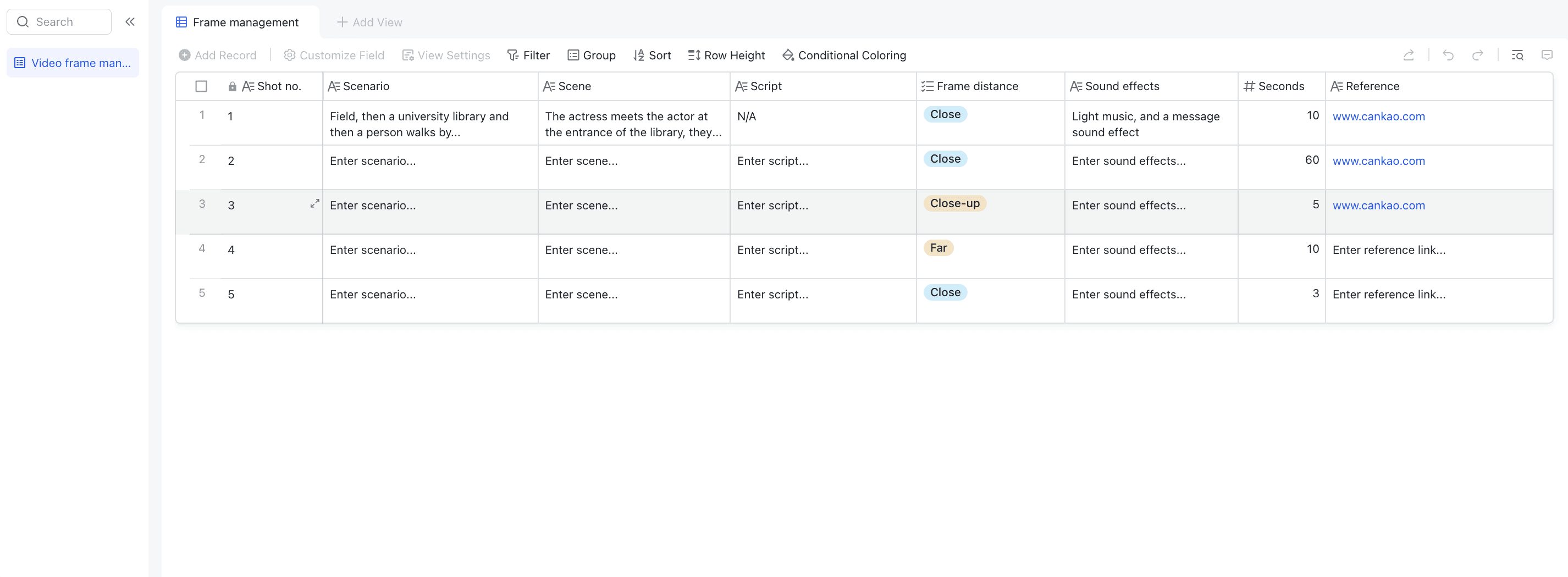 The Video Frame Management template is a comprehensive tool designed to streamline the process of managing video frames, scenes, scripts, and sound effects. It provides a structured format for entering and organizing all the essential elements of a video project, including the scenario, scene, script, sound effects, and reference links. The template also features conditional coloring and allows for the customization of fields and records, making it a versatile tool for any video project.