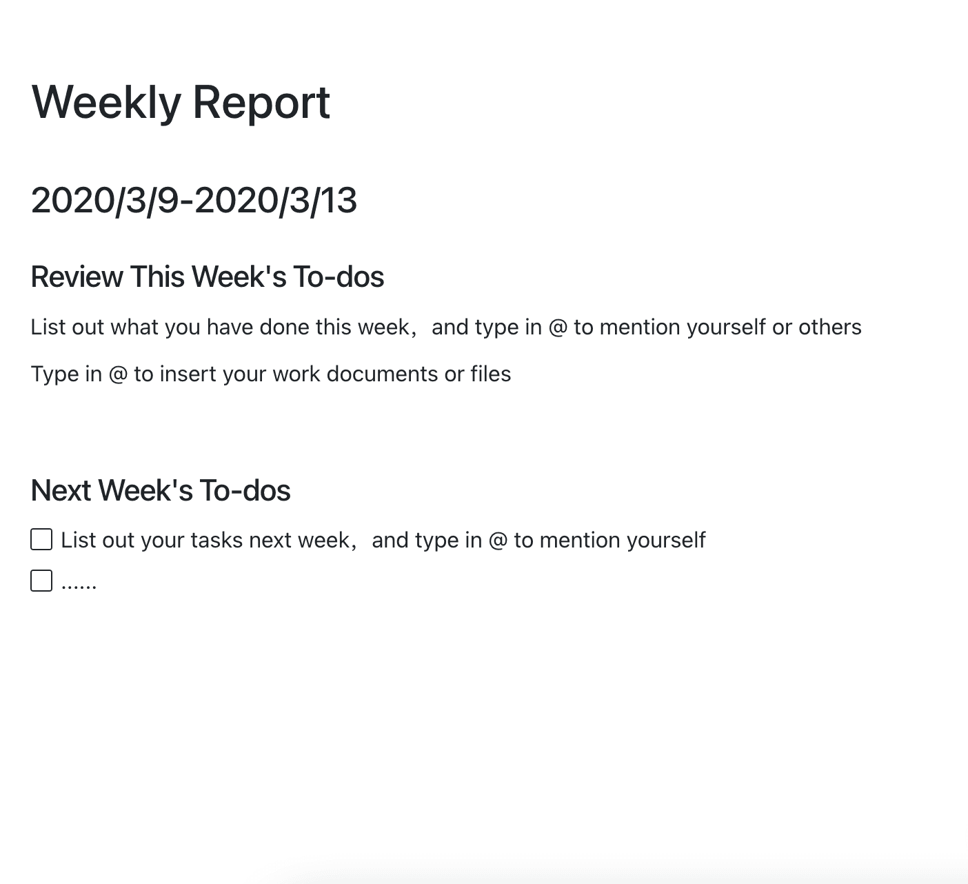 Keeping track of your weekly tasks and accomplishments is crucial for staying organized and ensuring that you're making progress towards your goals. With Lark's Weekly Report template, you can easily review your completed tasks, plan for the upcoming week, and collaborate with your team members by mentioning them or attaching relevant documents and files. This template is designed to help you stay on top of your workload and make the most of your time.