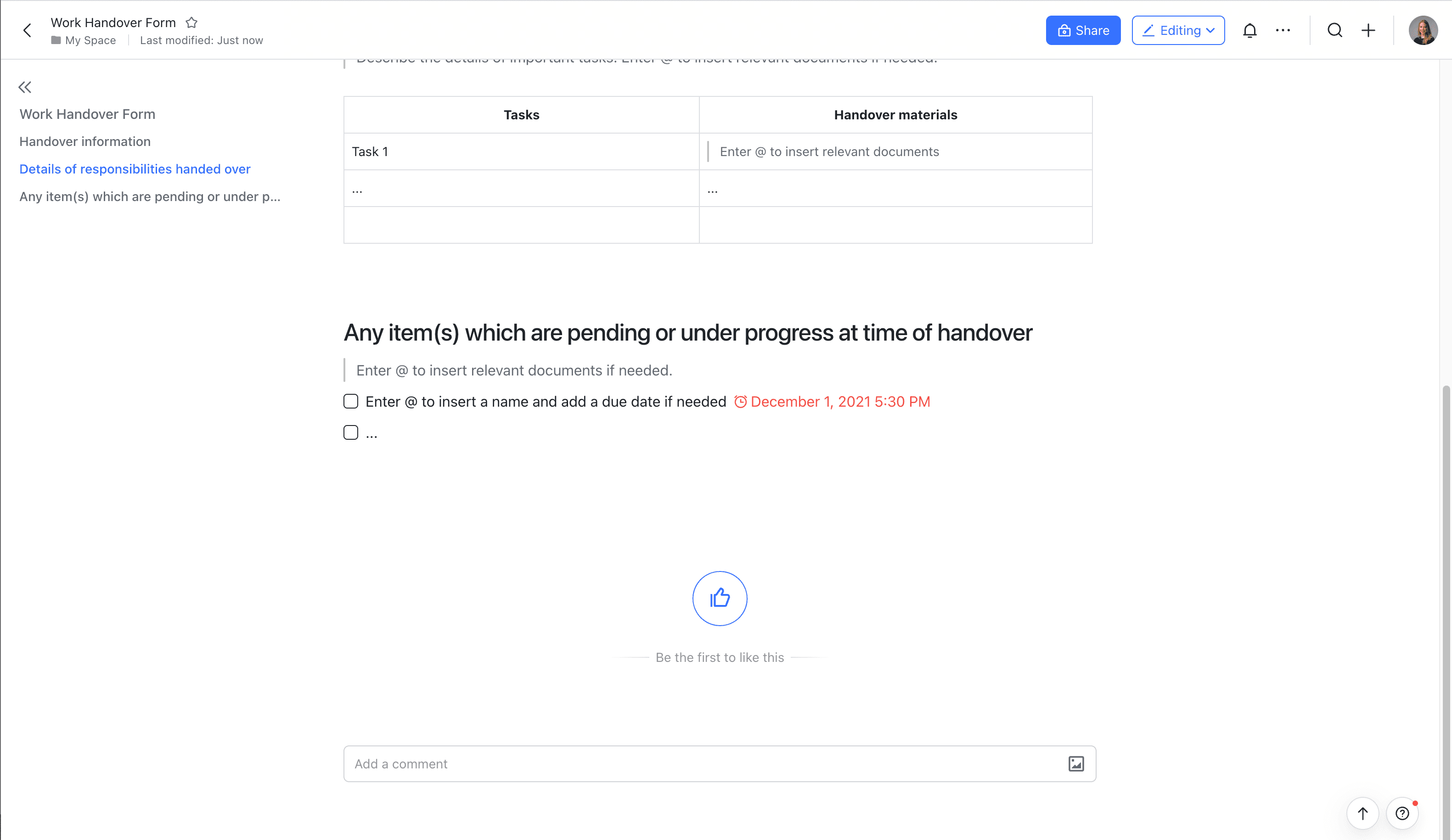 2. Seamless collaboration: Use Lark's features to mention team members, insert relevant documents, and set due dates for pending tasks, ensuring clear communication and collaboration during the handover process.