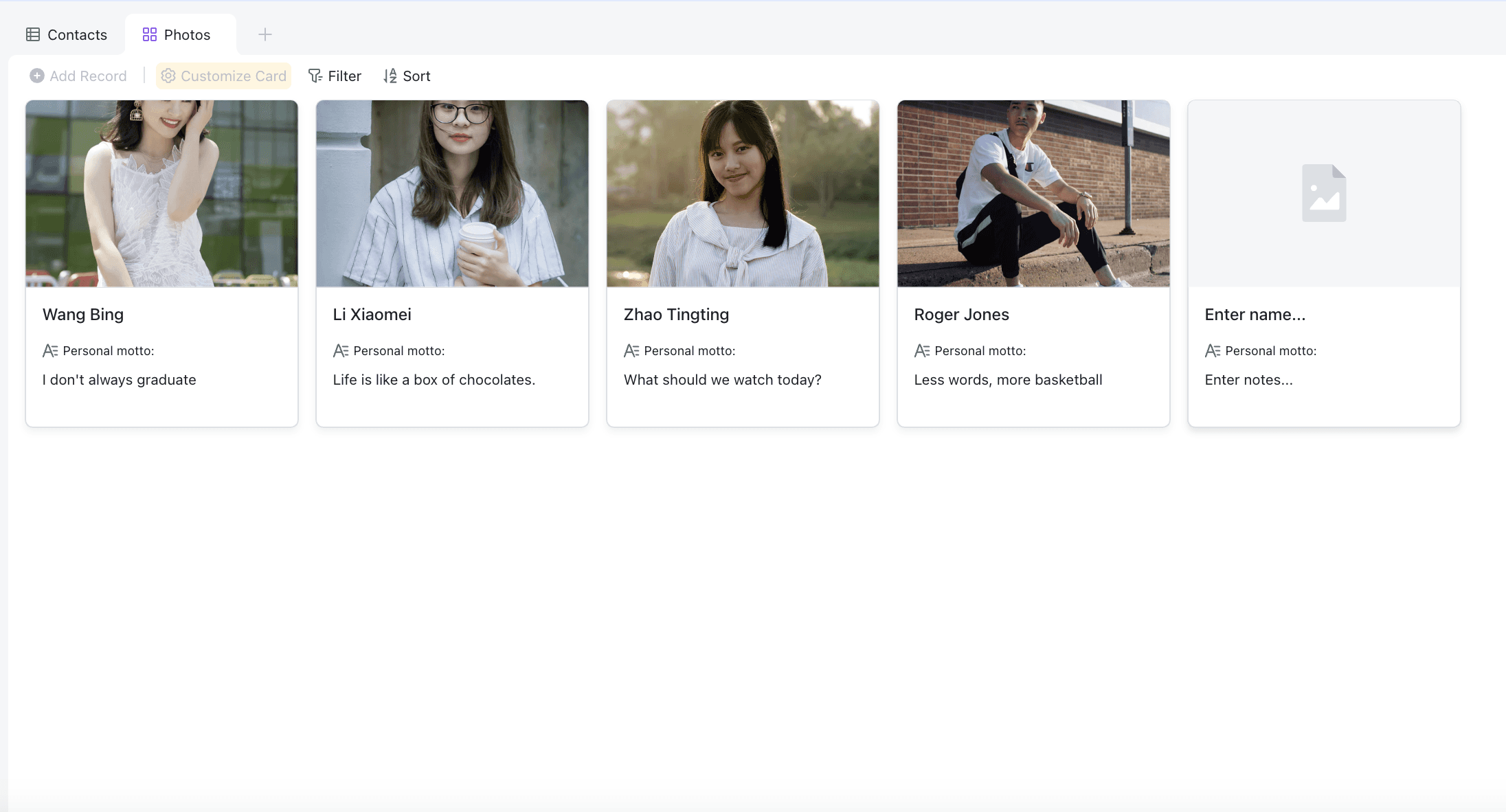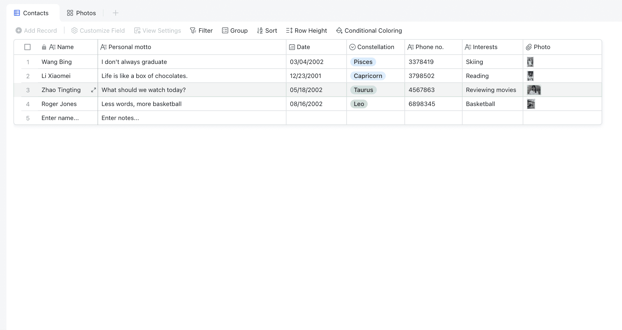 This template is a comprehensive tool for creating a yearbook. It allows you to compile all the necessary information about each student, including their name, personal motto, date of birth, constellation, phone number, interests, and even a photo. The template is designed to be easy to use and customize, with options for filtering, sorting, and adjusting row height. It also features conditional coloring for easy visual organization.