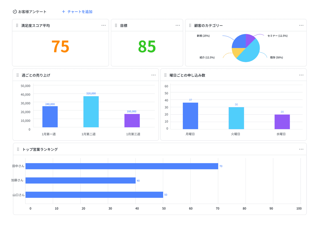 また、蓄積されたものがダッシュボードとしてグラフ化され、それを週に一度、トークに配信することで部門の評価を全員が確認できるようにしました。社員がとても重要な指標であるお客様データを頻繁に確認し、経営に活かしています。