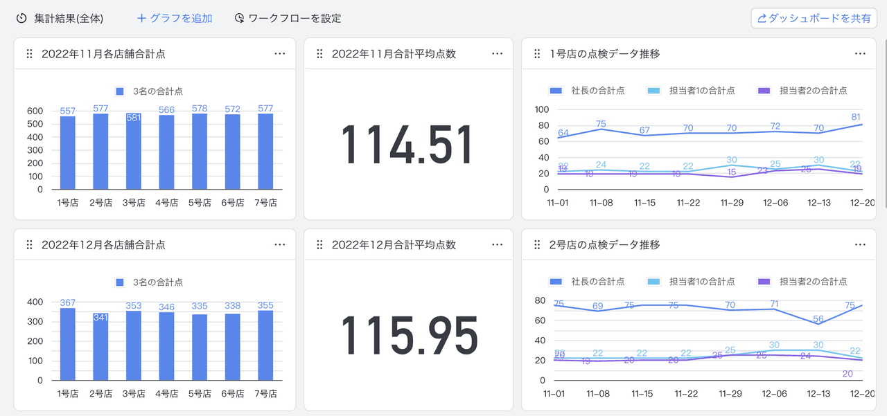 この一連のプロセスを支えているのは、Lark の Base です。開始ボタンを押して各採点項目に対し点数をつけるだけで、自動的に数字が統計され、各店舗の変動や店舗間ランキングなど、リアルタイムにダッシュボードで可視化されます。