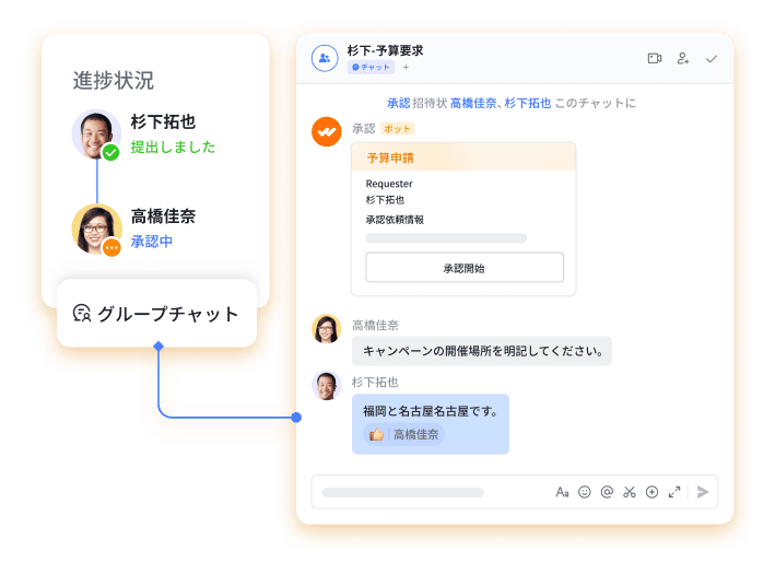 承認ステータスもリアルタイムで確認でき、承認が完了した直後にチャットに通知されるため、スムーズに手続きを進めることができます。