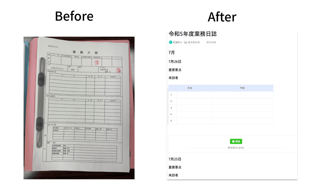 稲邊さん:例えば、商工会では毎日の会議や来訪者とその詳細を記録に残す必要があり、業務日誌を毎日作成しています。今まではWordで記入し、紙に印刷して、指導員、職員、補助員、次長と会長まで印鑑を押してもらい、その一連の流れは2週間くらいかかる場合もあります。Larkに切り替えた後に、まず会議の内容をLarkのカレンダーや自動議事録で自動的に残るので、記入事項自体が簡素化されます。また、LarkDocsに既読するかどうかをチェックできる情報収集機能があるので、一々ハンコを押して回す必要もなくなり、スマホやパソコン上でボタンを押すだけで完了になります。これでLarkDocsに毎日の業務日誌をまとめることになり、毎年300枚程度の紙を1枚にぎゅっと集約できたことに対して、職員みんなが驚きましたね(笑)
