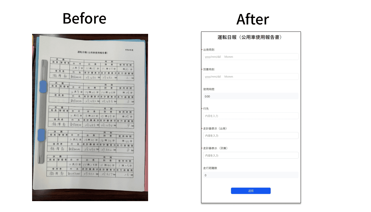 高橋さん:また、商工会の共用車の使用をきちんと報告する規程があり、それも今まで全て紙で記録していました。Larkではスマホよりフォーム形式で入力ができるようになりました。使用時間と走行距離数が自動計算され、誰がいつ提出したかもシステム上に記録されるので、だいぶ楽になりました。一年で計算すると50時間程度時間短縮ができましたね。