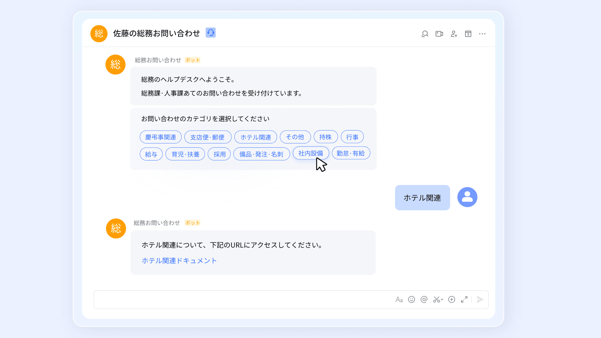 こうした課題に対し、Larkのヘルプデスク機能を活用して、問い合わせ内容をカテゴリーごとに整理するとともに、Bot 自動応答・FAQの集約・キーワード検索などを組み合わせた問い合わせ窓口を構築しました。