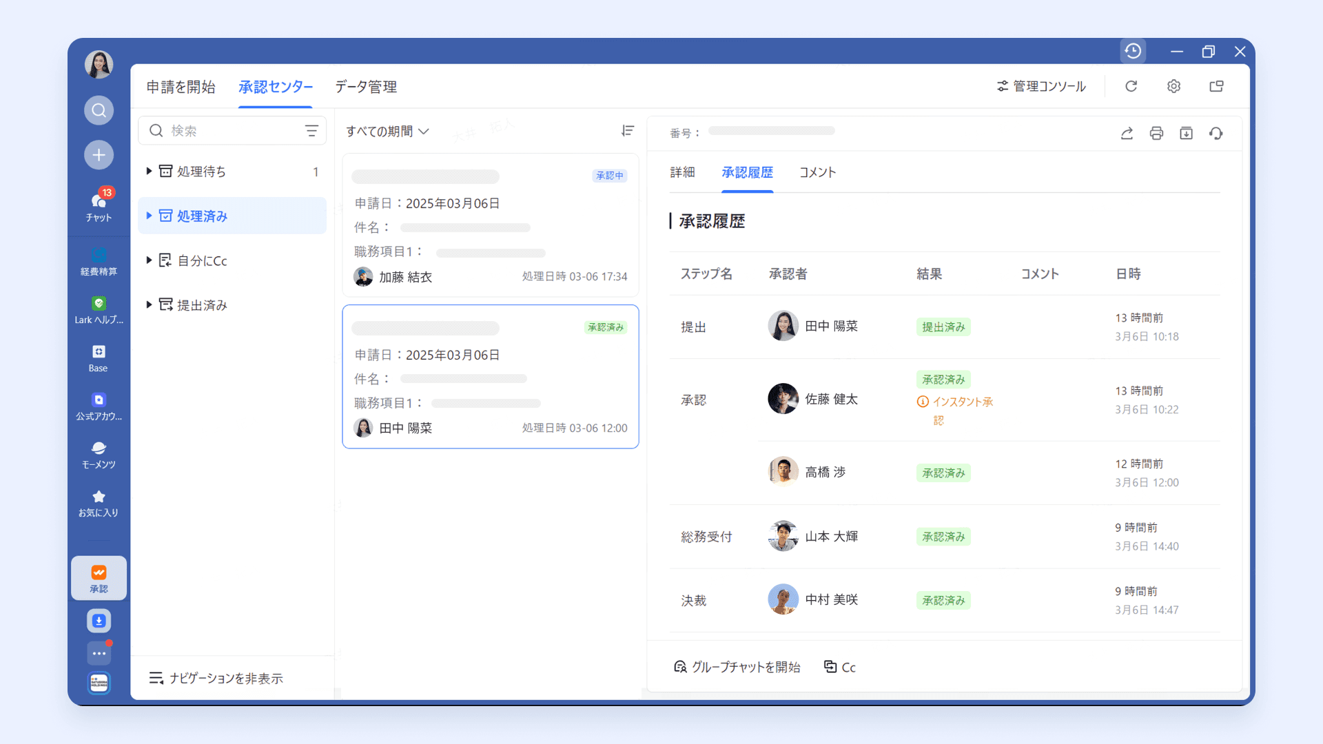 稟議・決裁承認を既存の決済システムからLarkに切り替え、簡潔なワークフローで構築。必要な通知がプッシュされ、即座に承認が可能になった。併せて職務権限も見直し権限移譲するなどした結果、稟議・決裁にかかる所要時間数が大幅に改善