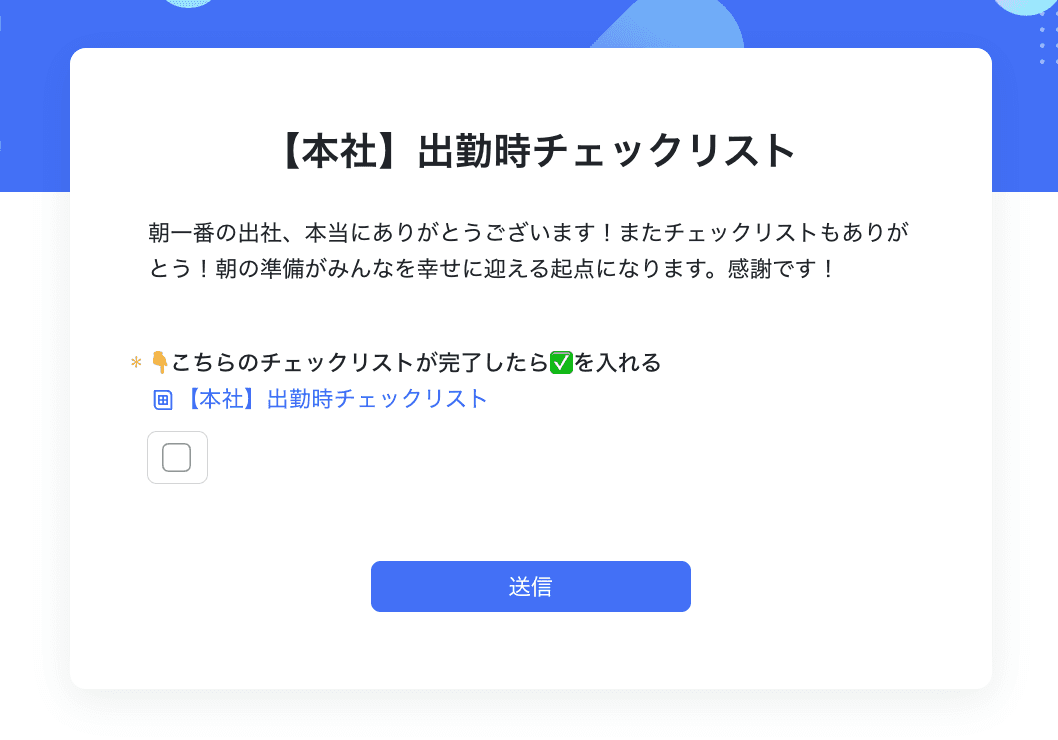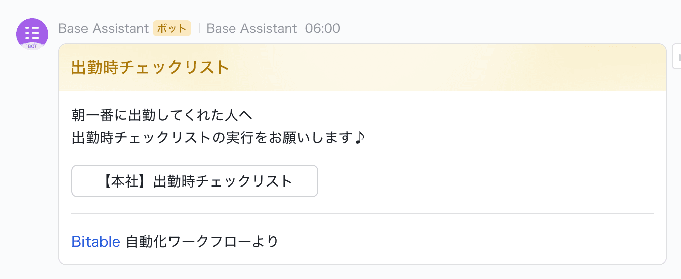 この出勤時チェックリストがタスクとして毎日出てくる設定にしました。それを誰かが完了して完了ボタンを押すと、従業員が入っているチャットグループで、「朝の準備が完了です」というアナウンスと共に、誰がやったかがボットが教えてくれます。
