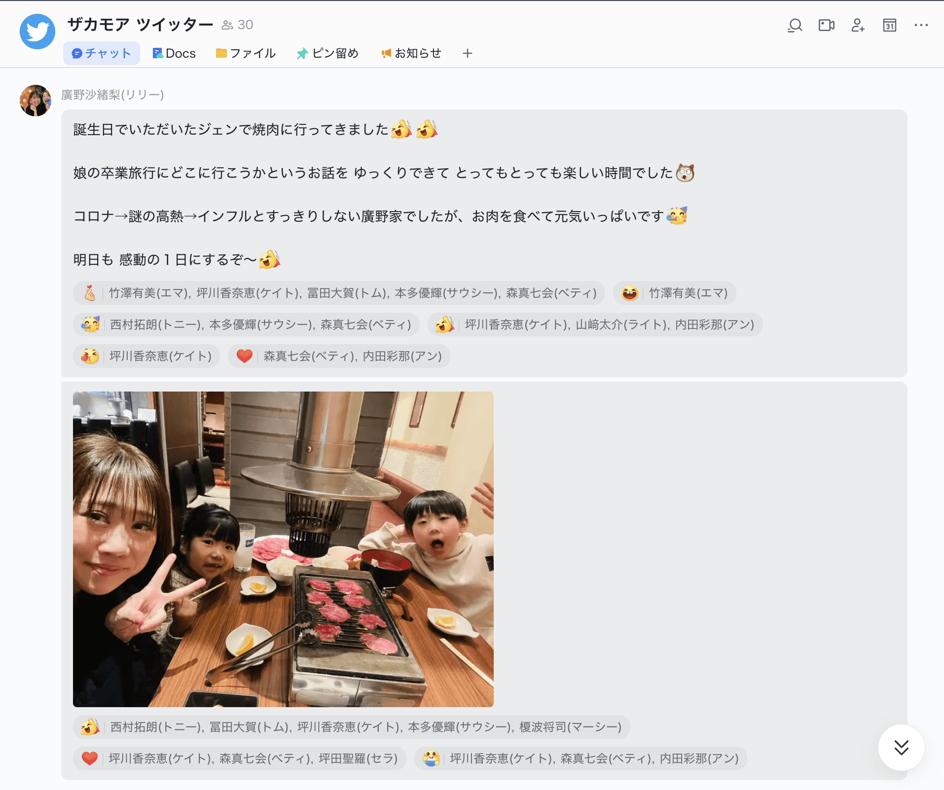 例えばこれは社員が焼肉に行ってくれた時の写真で、みんなからいろんなリアクションやコメントが入っています。つまり、社員の円滑なコミュニケーションにLarkのツールが役に立っているということです。
