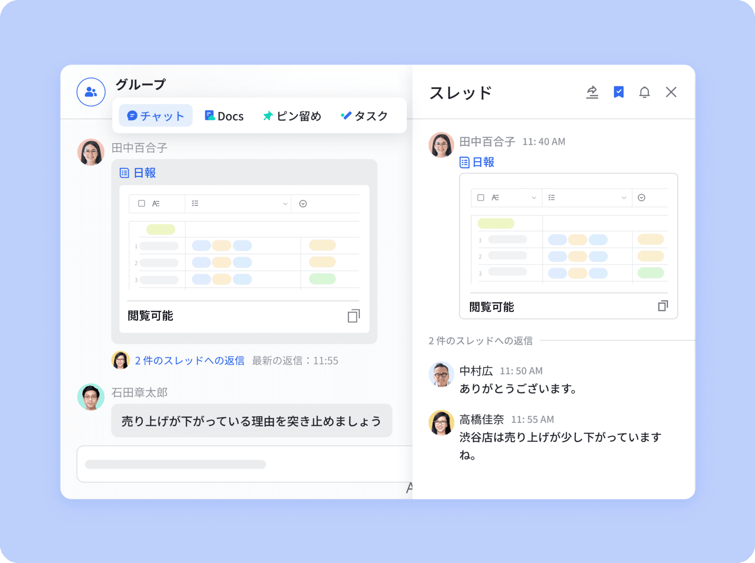 Larkで売り上げ管理が効率化。複数の店舗やチームからの売り上げデータを集約し、リアルタイムで可視化・分析することが可能です。さらに、売り上げのトレンドやパフォーマンスを迅速に把握し、適切な戦略の立案や調整が行えます。情報共有が円滑化し、チーム全体が一体となって目標達成に向けて努力できる環境を提供します。