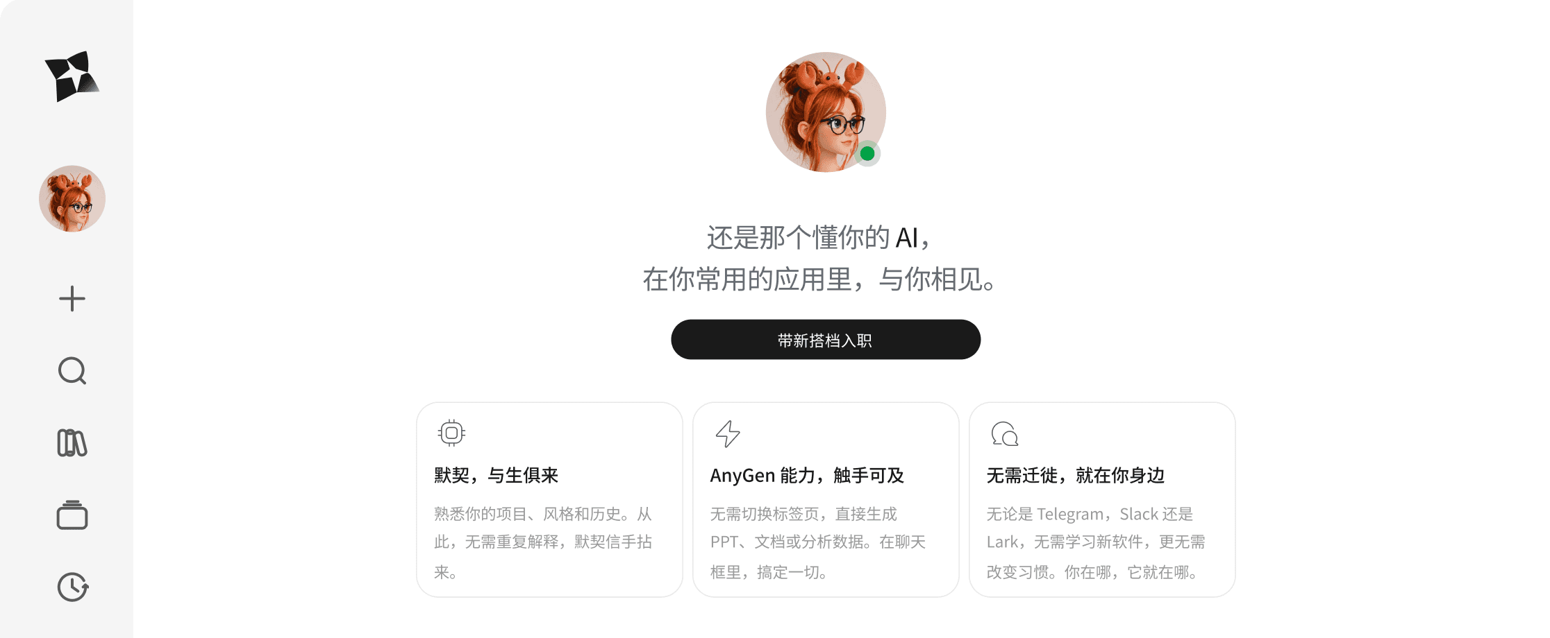 访问 AnyGen AI 搭档页面,点击「带新搭档入职」,并使用 Lark 账号登录