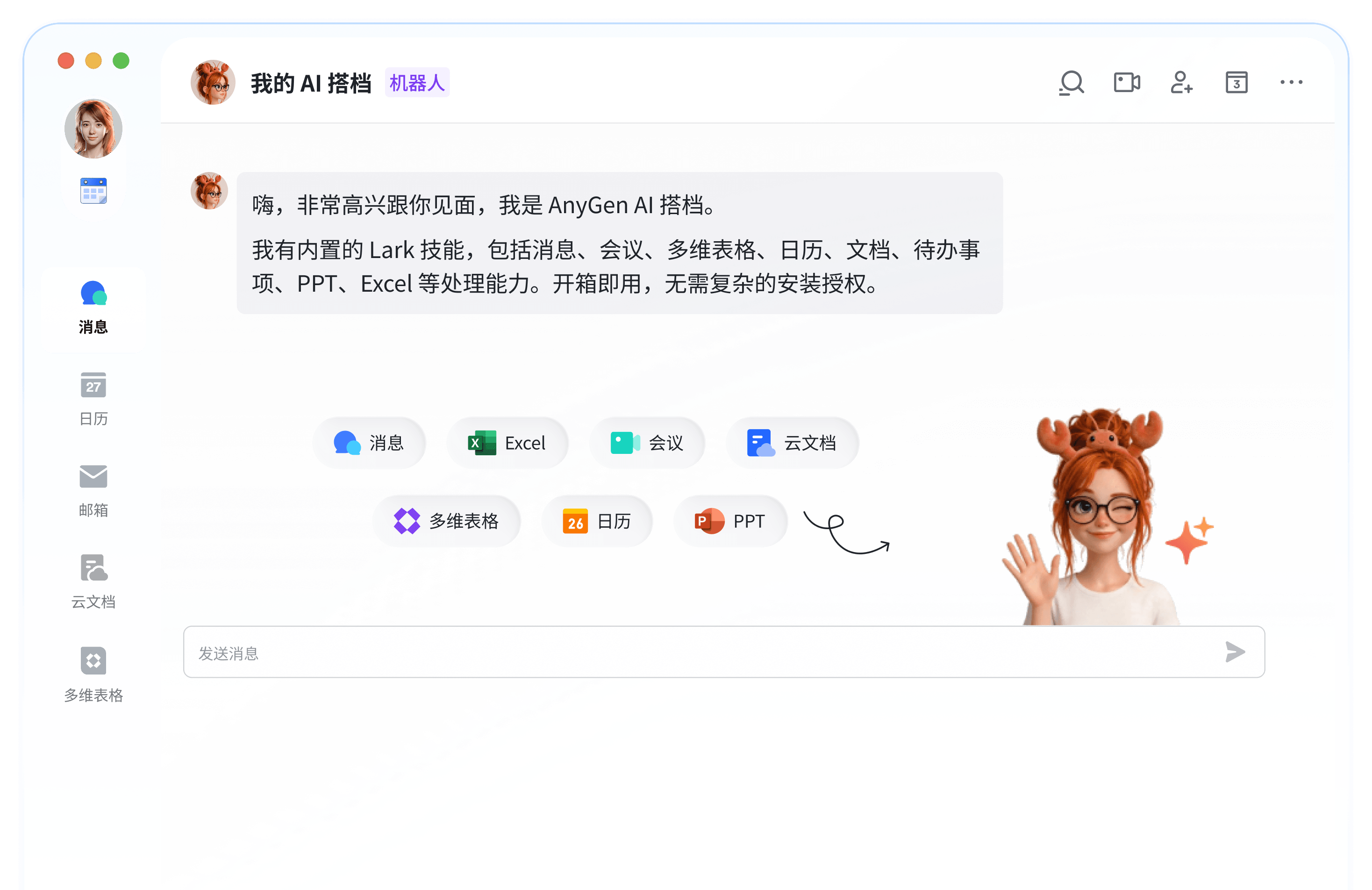 为你的 Lark 工作区打造全能 AI 搭档,一站式处理消息、智能生成内容、自动化工作流,全面引爆团队效率。