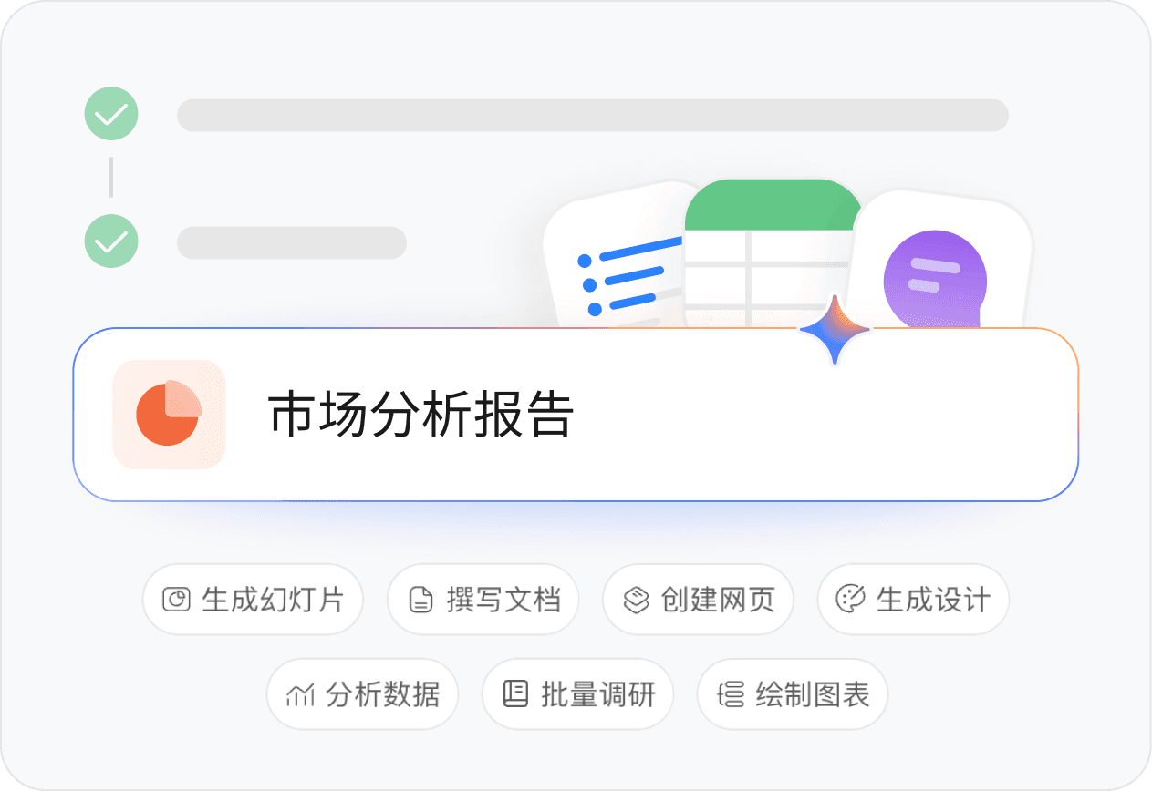 将分散信息转化为可直接使用的成果物,包括日报、周报、简报、任务清单、风险列表、分析报告、策略建议,以及文档、幻灯片、网页、图片和数据分析结果,并支持 AI 生成后由人工精修成终稿。