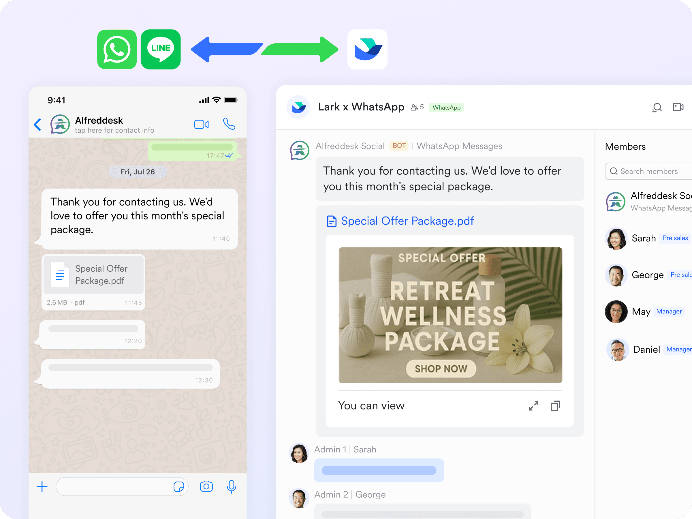 Sync WhatsApp and LINE messages with full chat history securely stored in Lark for easy management.