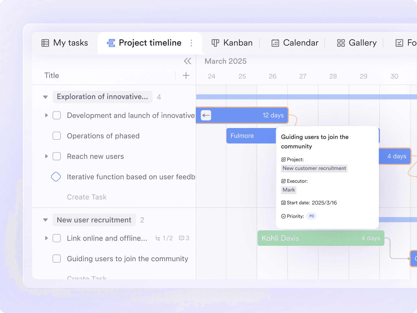 Gantt view: Visualize project timelines, deadlines, and milestones at a glance.