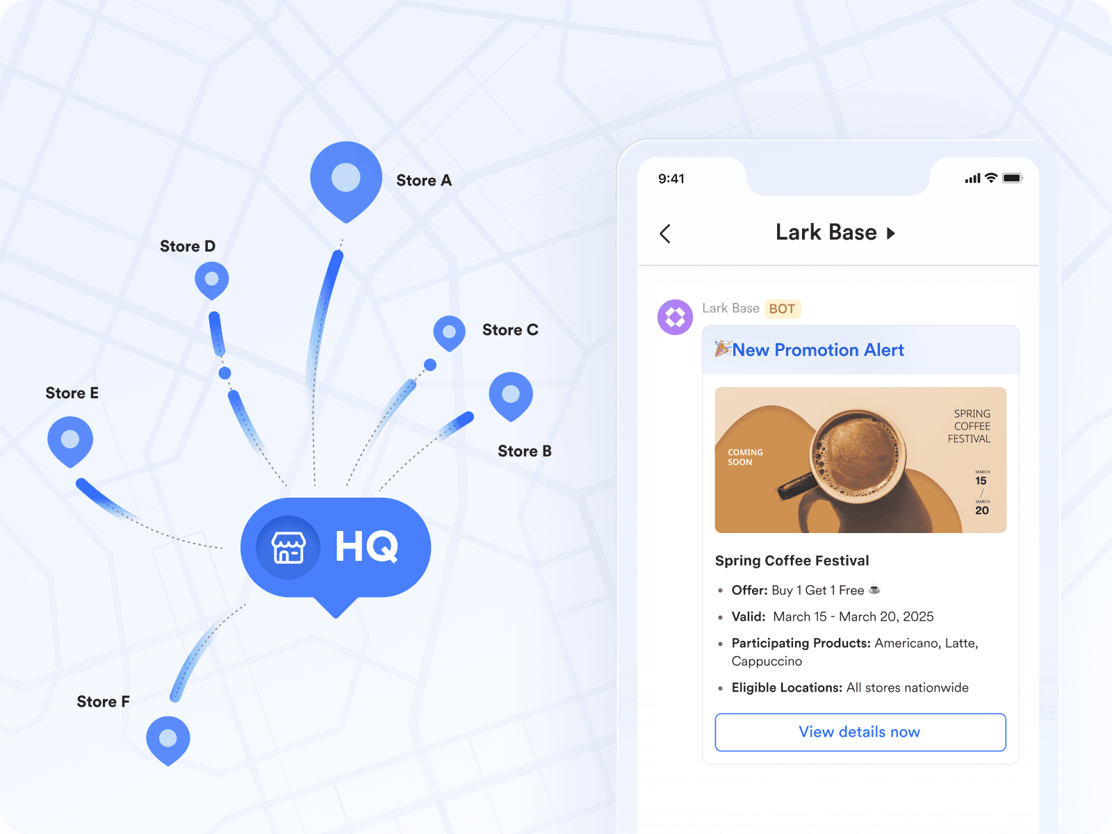 key announcements like marketing strategies and price adjustment can reach your stores in real time through Lark Base messaging.
