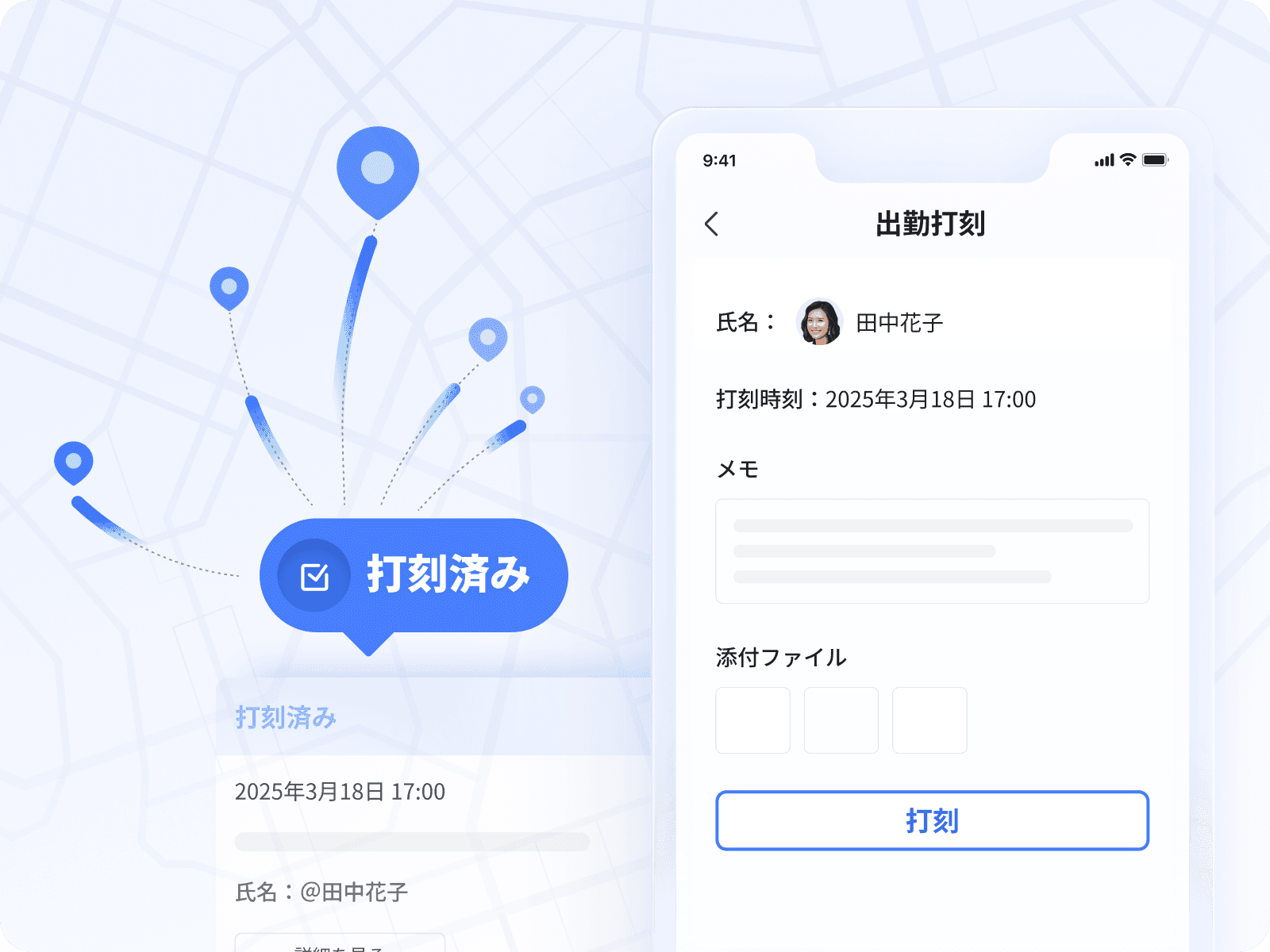 出勤時・退勤時の打刻をスマートフォンで簡単に行えます。