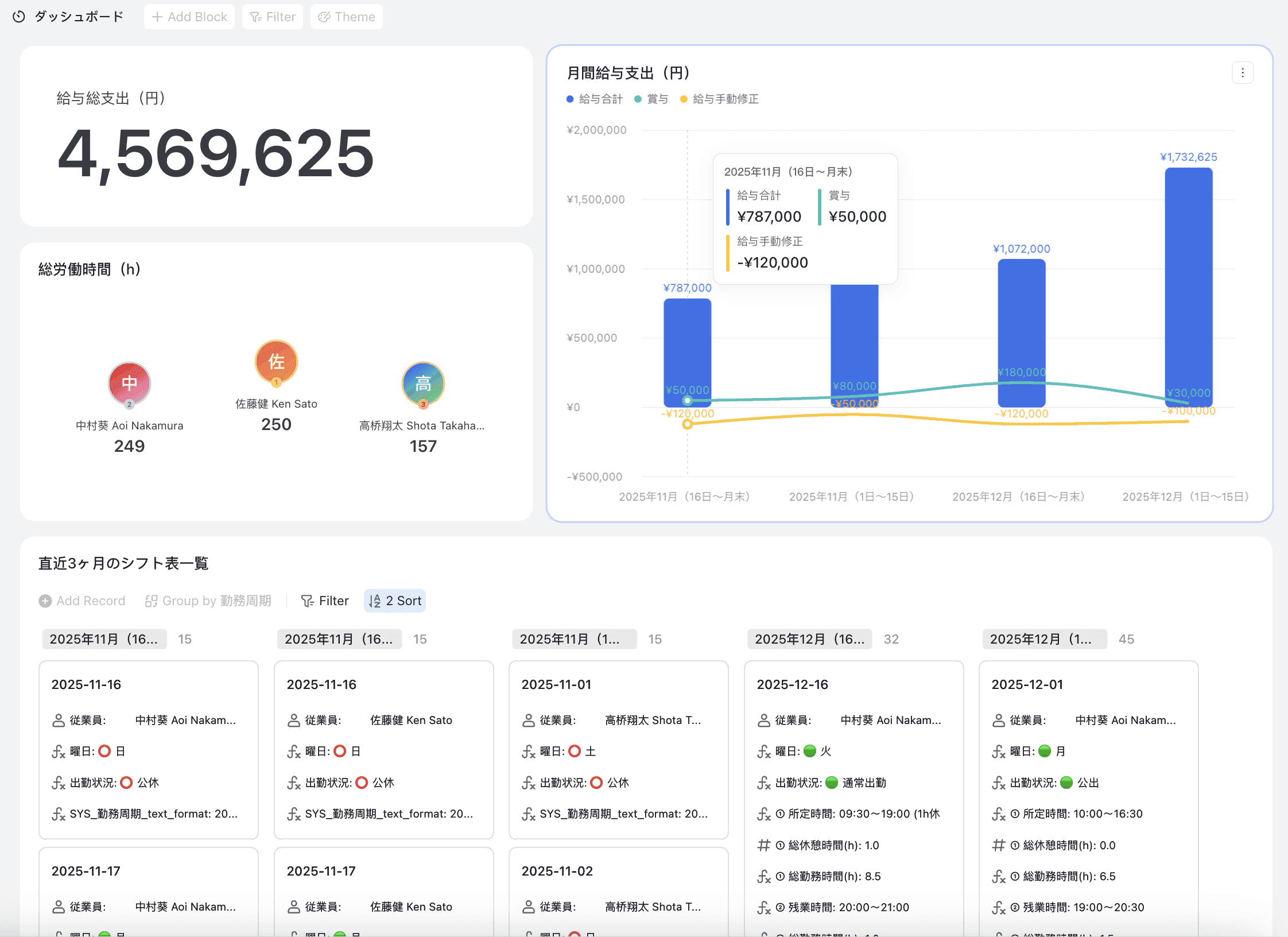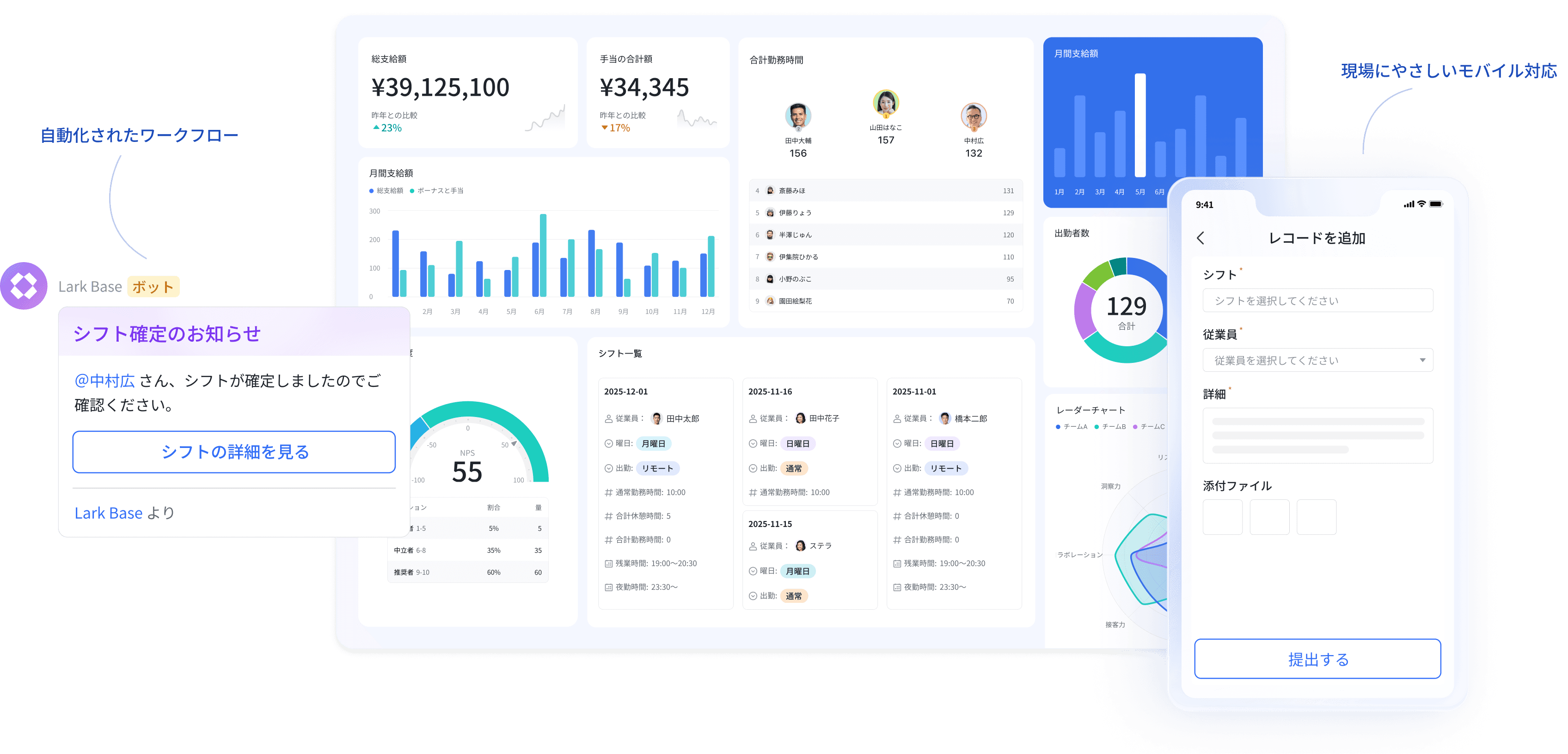 シフト作成から給与計算、通知まで自動化。勤怠・給与データの見える化で効果的な意思決定を支援。既存システムの統合も簡単。