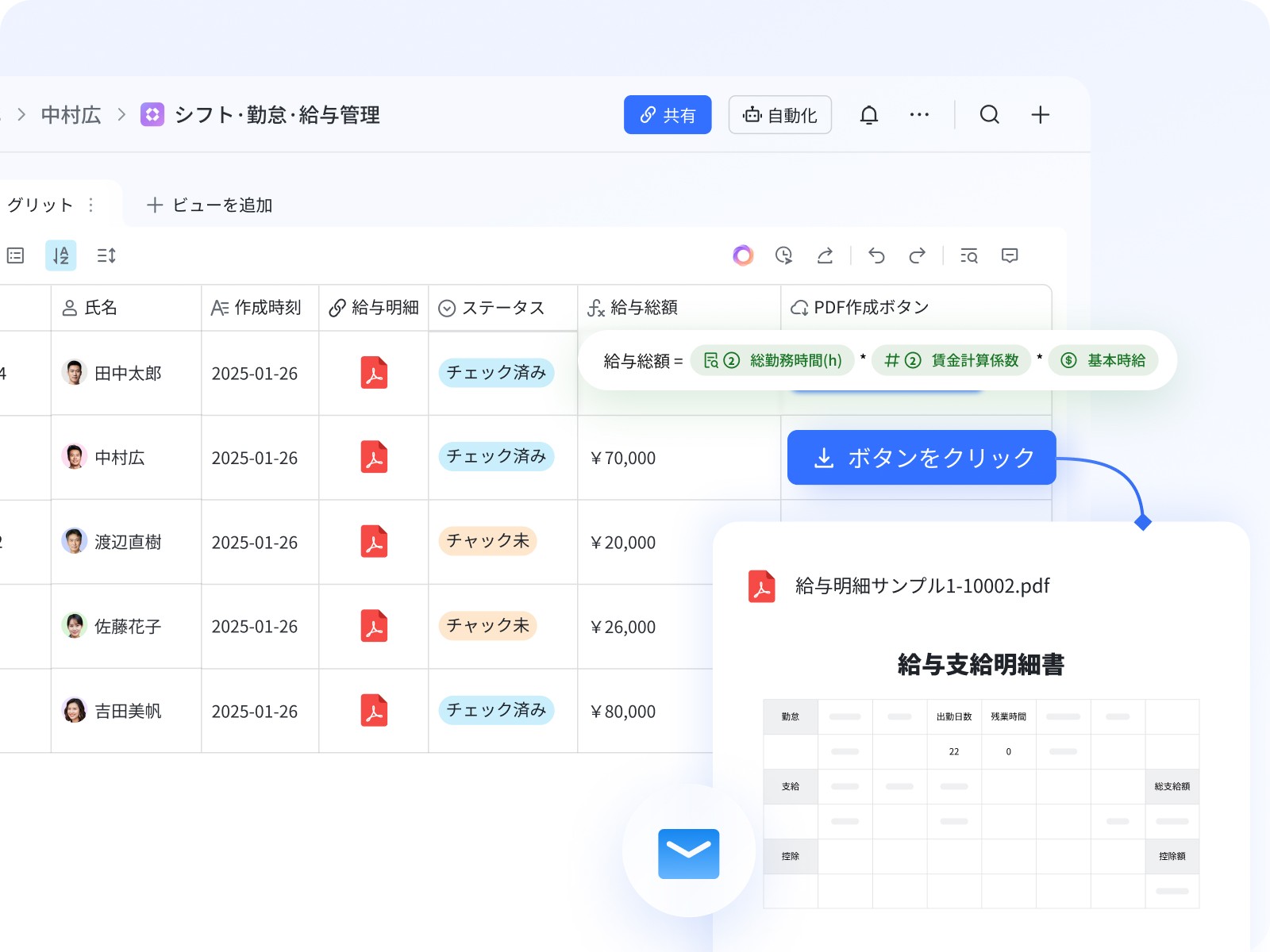 ボタン1つで給与明細をPDF化し、自動でメール配信します。
