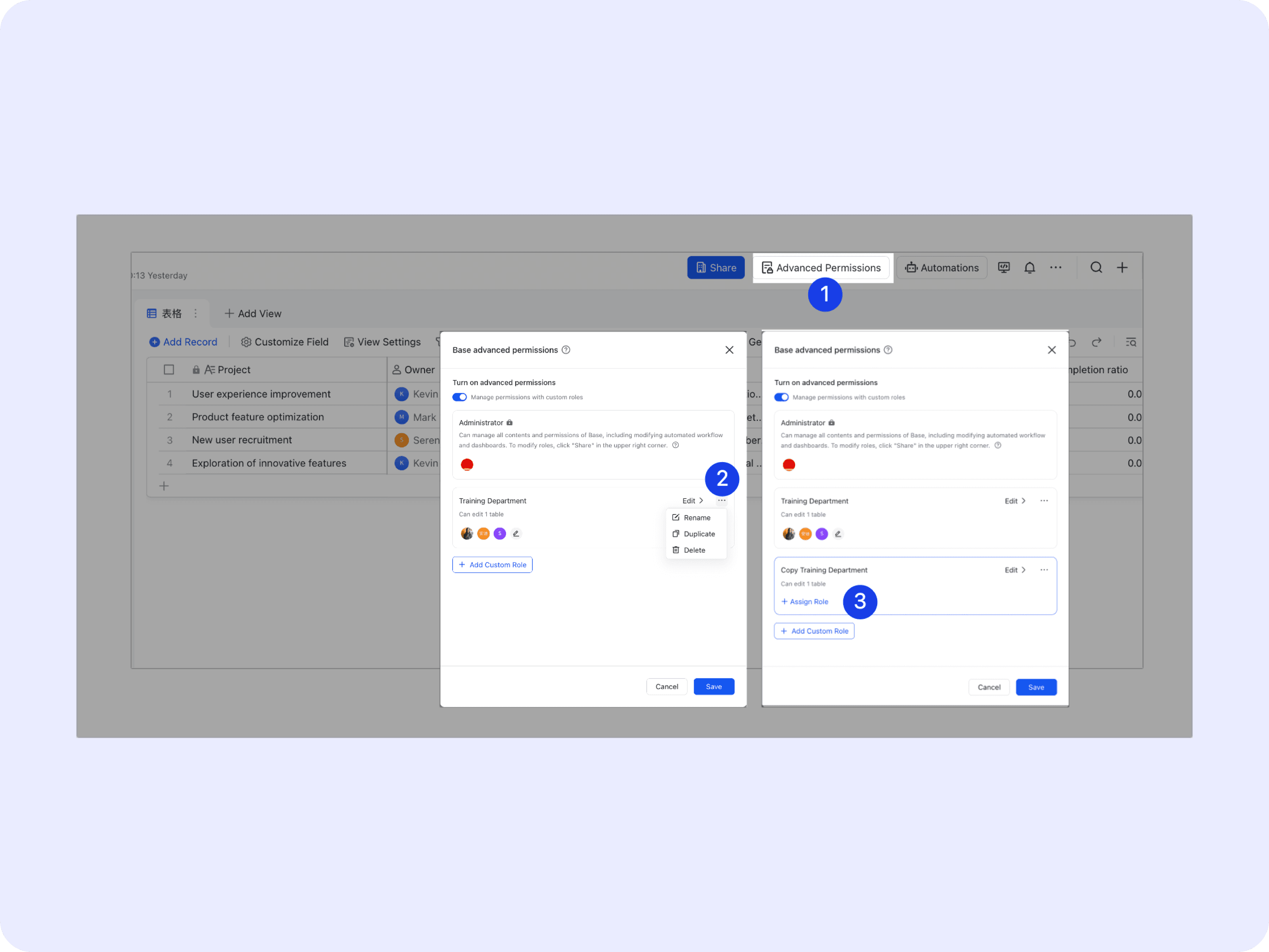 Set who can view and edit specific fields or records in a table, and who can access dashboards and views by creating and assigning roles to members with different permission needs.